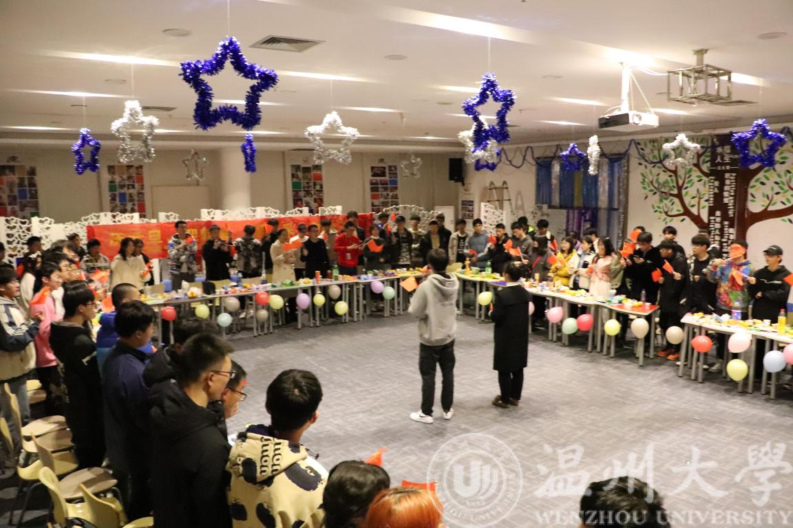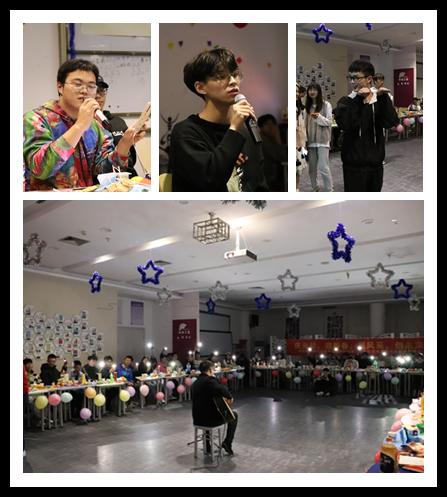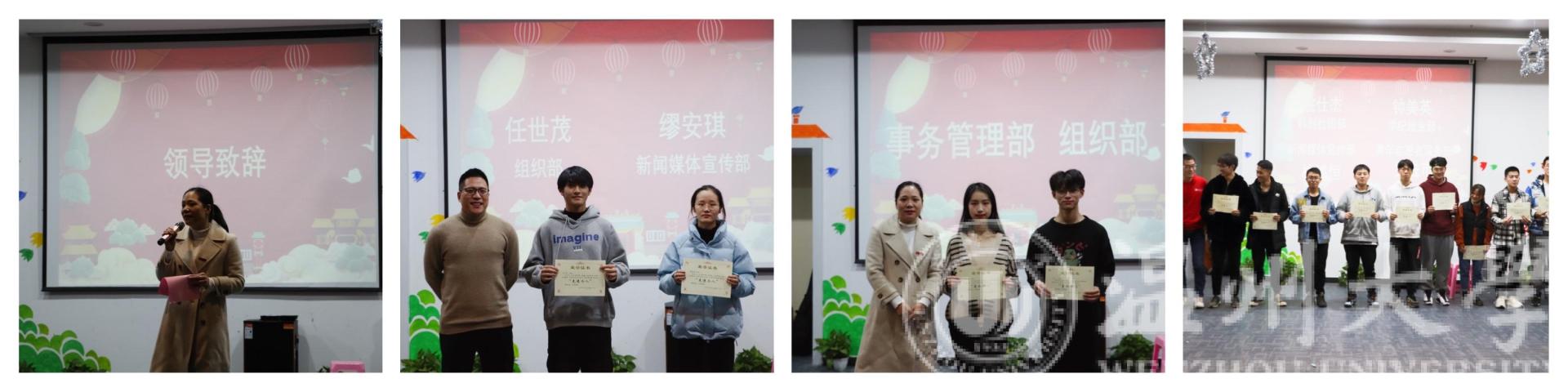 晚上18:30,大会正式开始。史贽豪同学向在场同学逐一介绍出席本次会议的领导和老师,同学们报以热烈的掌声与崇高的敬意。晚会第一篇章:赞·青春——表彰先进。首先,由学院党委副书记曾蓓蕾老师发表致辞,她总结本学期团学的工作,肯定了团学对于学院发展和学生成长所做出的的重要贡献,鼓励团学成员再接再厉,她还提出新一年的期望,并预祝大家元旦快乐。随后,章窈尔同学宣布获十一月先进个人称号与星级部门的名单,由曾蓓蕾、廖晓安、岳通通、潘龙飞五位老师分别为获奖同学与星级部门代表颁奖。表彰之后,柳超宇、宓哲文带来歌曲《会不会》,他们动情的歌声表达了自己对于团学的热爱,紧接着进行第游戏和抽奖环节——《听歌识曲》,同学们争相举手回答歌曲。晚会第二篇章:聚·青春:同舟共济。首先,由素拓实践部成员带来小品《不差钱》,他们精彩的表演赢得了现场的掌声。随后,吴天愉带来歌曲《可乐》,青年志愿者服务部成员带来歌曲《告白气球》,使得现场气氛逐渐推向高潮。最后,进入第二轮游戏环节和抽奖环节——《快乐传真》。晚会第三篇章:唱·青春:逐梦前行。首先潘龙飞老师带来吉他弹唱——《夜空中最亮的星》,同学们沉浸于动听的歌声,希望2021年,大家努力奋斗,争做“最亮的星”。随后,组织部成员带来歌曲《陪你度过漫长岁月》,表达告别20年迎接21年的激动心情。接着,桂鑫洋、姚仕杰带来歌曲《菲菲》。伴随歌声,晚会进入第三轮抽奖环节。