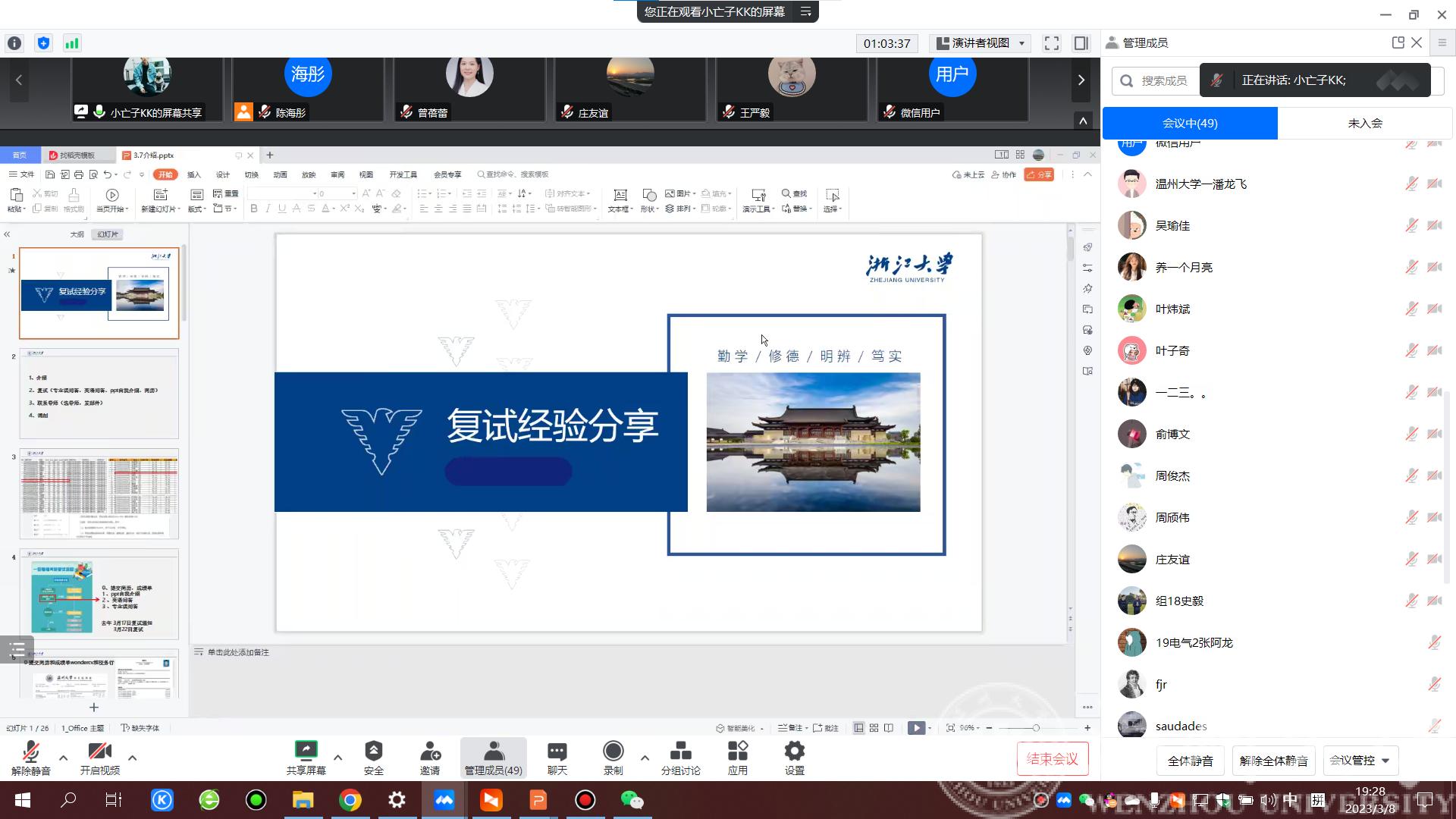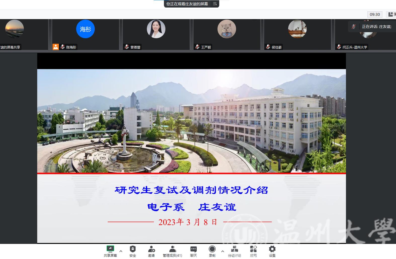 为进一步帮助蜜桃视频 2023届考研学子掌握复试技巧及调剂方法,增强复试信心,3月8日晚上18:30,蜜桃视频 召开2023年考研复试指导暨经验分享的线上会议。学院党委副书记曾蓓蕾、学院挂职副院长张鉴,电子系主任庄友谊、电气系专业老师闫正兵,2019级辅导员潘龙飞,考取浙江大学、上海电力大学等高校的三位往届优秀校友,以及2023届考研学子出席本次交流会。会议由学工办辅导员陈海彤主持。