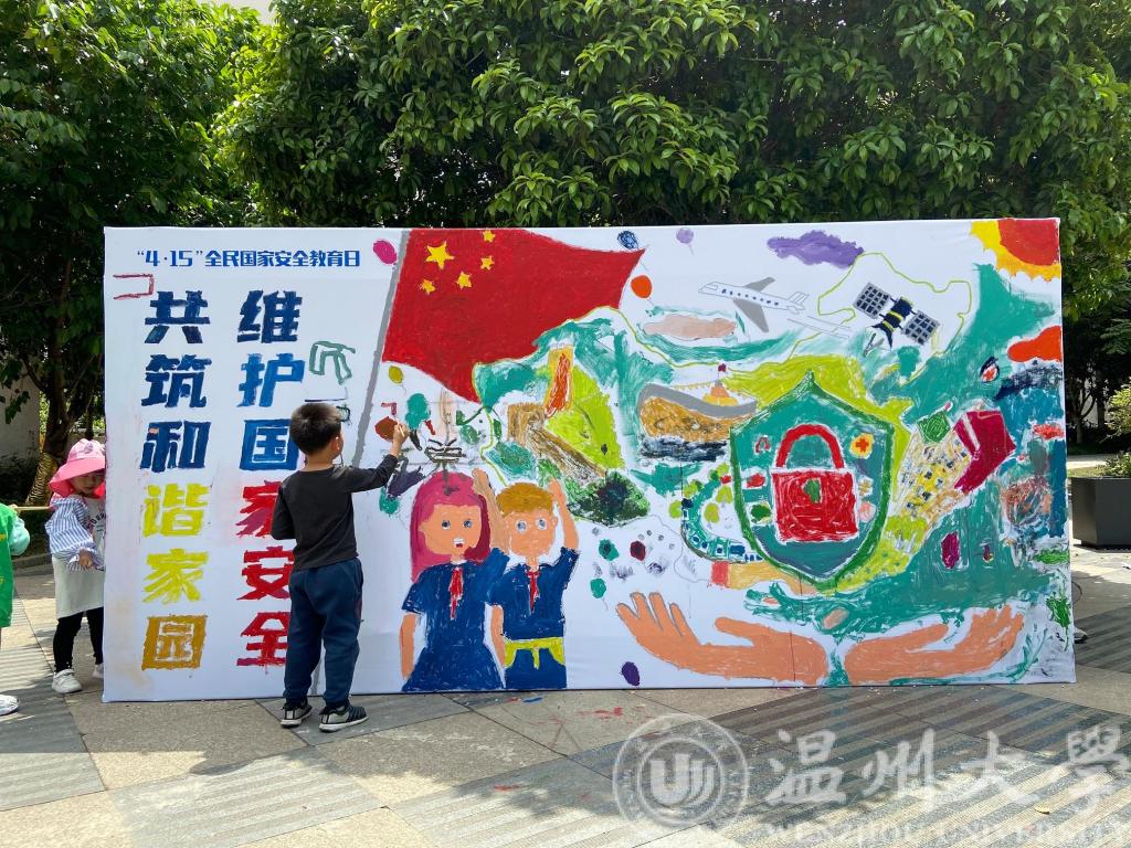 “国家安全包括了很多,比如说和小动物一起友好地共存叫做生态安全……”在喷绘上完成安全主题漫画后,党员们牵着小朋友围着画布站了一圈,用简单易懂的方式介绍着画布上的内容,其中涉及到生态安全、社会安全等一些小朋友们更能明白的方面。