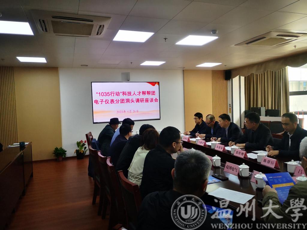 为深入贯彻落实党的二十大精神和中央促进共同富裕、省委“两个先行”决策部署,根据市《关于开展人才引领山区海岛县共同富裕“1035行动”的实施意见》目标要求,科技人才帮帮团-电子仪表分团团长汪鹏君教授携蜜桃视频 、温州职业技术学院相关人员一行10人于4月26日前往洞头区科技局及科技园调研电子电器产业技术堵点及需求。