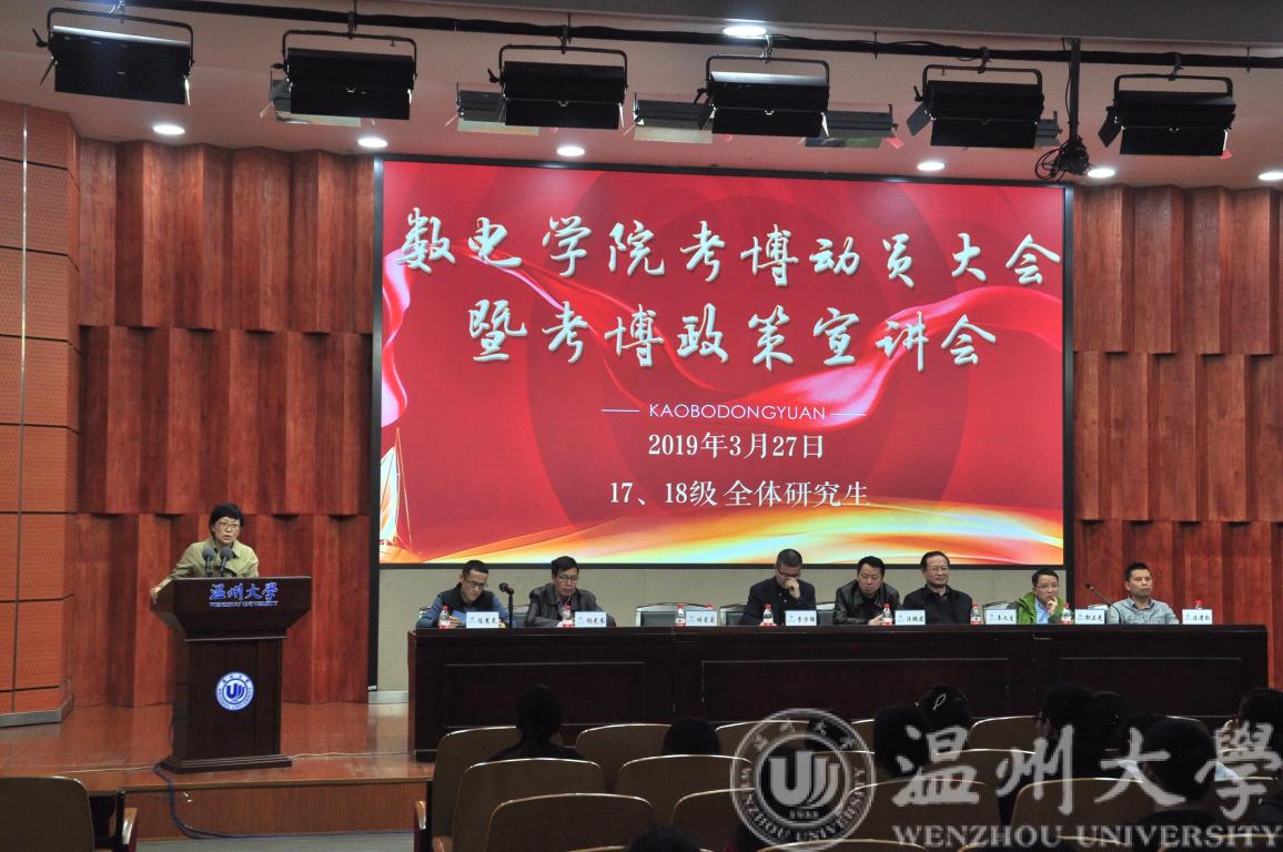 2019年3月27日15点30分,蜜桃视频 数电学院在岩松堂雁山厅召开了面向全体17、18级研究生的考博动员大会暨考博政策宣讲会。数电学院院长汪鹏君、党委书记李方强、副院长韦文生、党委副书记林爱菊及各硕士点硕导代表杨光参、郭正光、陈慧灵、陈孝敬共同出席了本次动员大会,本次会议由林爱菊书记主持。