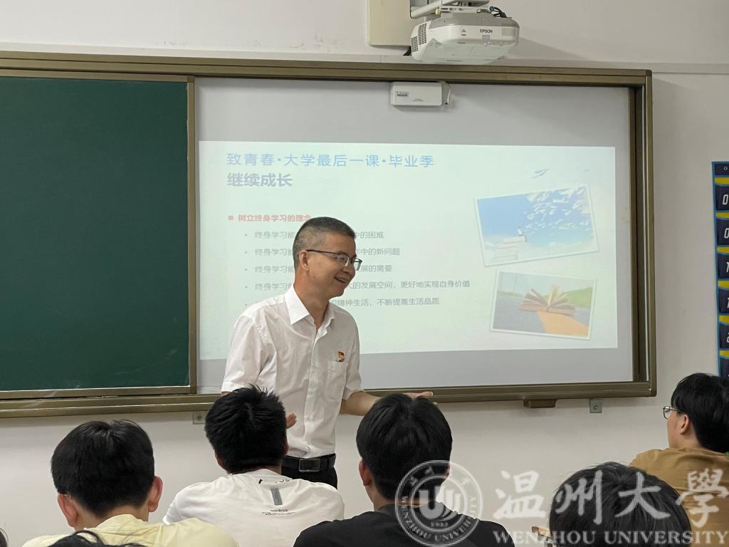 2023年6月19日下午3:30,在2023届毕业生即将告别温大校园之际,蜜桃视频 领导班子集体下班级,同毕业班班主任一道为毕业生上好最后一堂课。为做好本次毕业生教育,学院前期认真策划,精心组织,领导们围绕“立足当下,肩负青年时代使命”、“继续成长,树立终生学习意识”、“心怀感恩,培养优秀人格品质”、“展望未来,求学问是敢为人先”四个主题,分赴各个毕业班级,给毕业生们带去了尊尊嘱咐,勉励毕业生们,要听党话跟党走,勇于担当历史使命;要把劳意识形态关,坚持马克思主义信仰;要勤磨砺恒自律,提高能力本领;要懂感恩爱生活,成就精彩人生;要牢记温大校友身份,不忘校训院训,传承温大精神,在新的征程中继续发光发热,绽放最的青春。