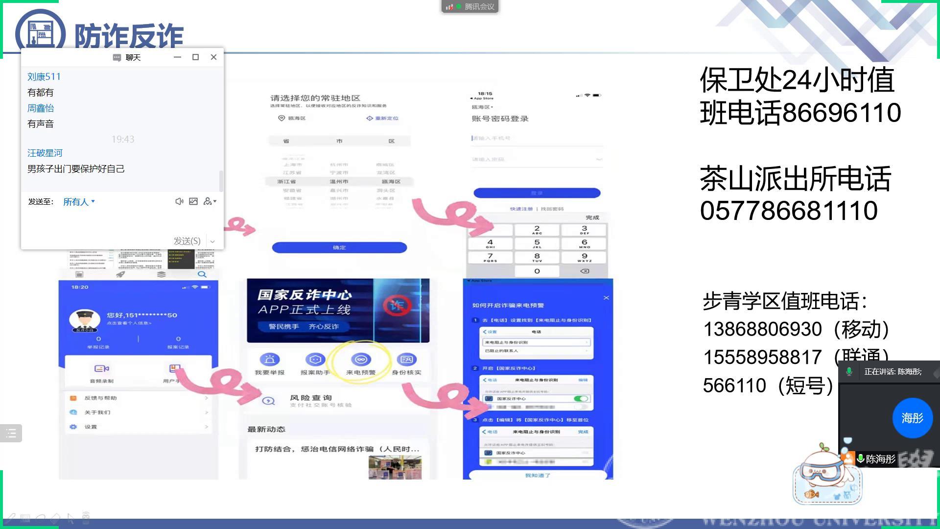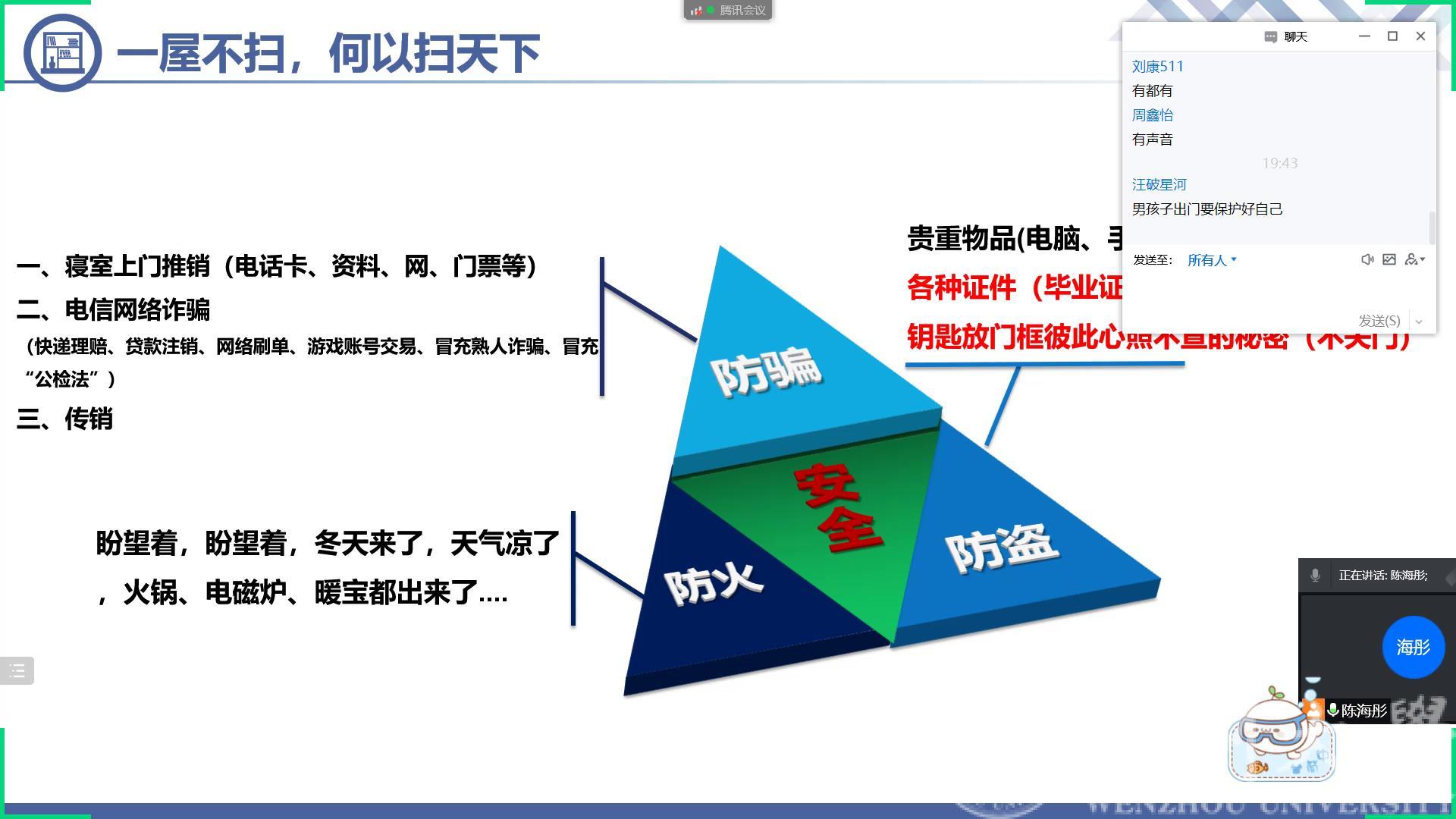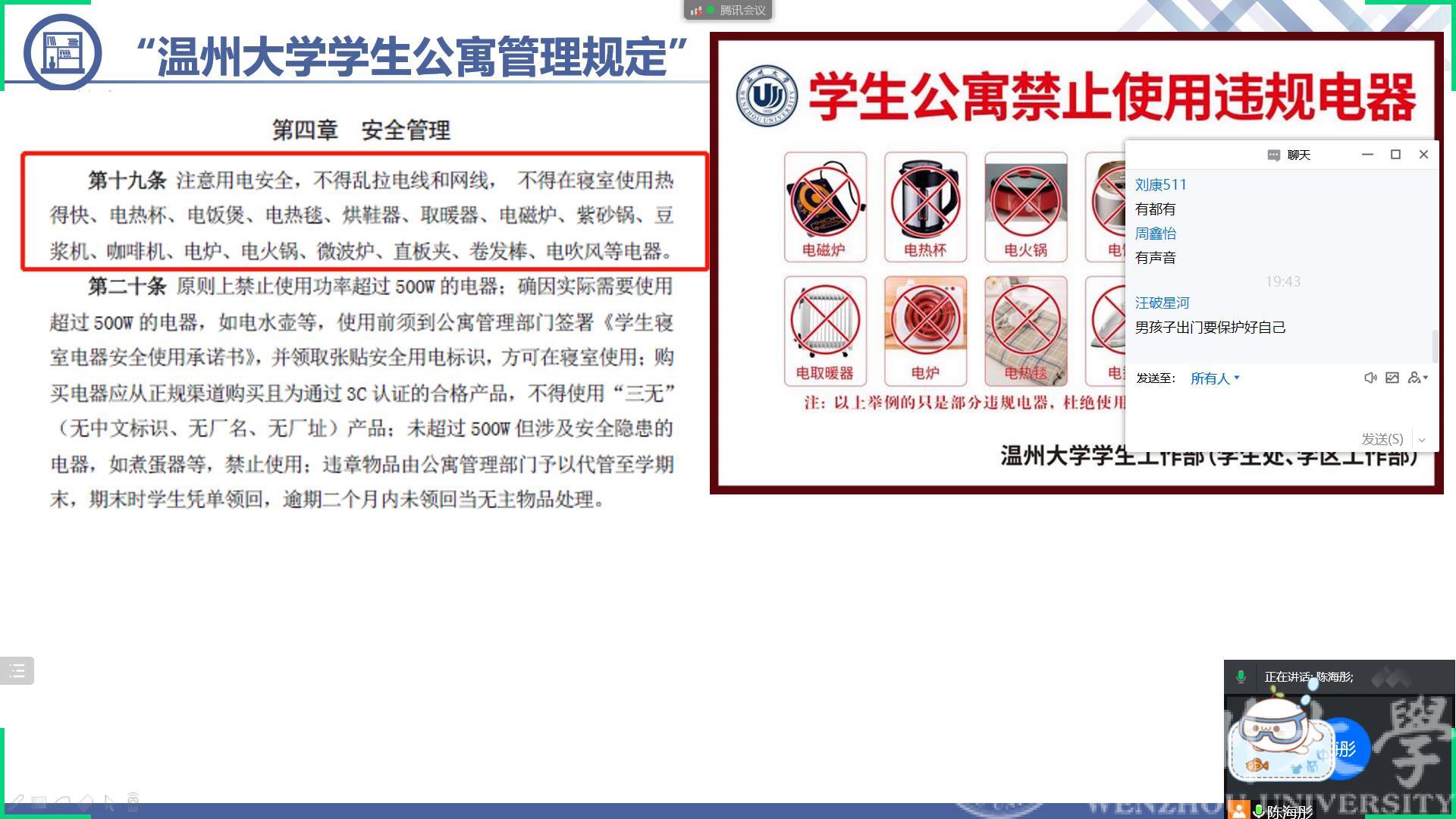 2月21日晚上19:30,蜜桃视频 召开全体寝室长线上会议。会上公寓辅导员陈海彤老师从寝室卫生管理、公寓安全管理、防诈反诈、寝室关系、宗教政策以及心理健康方面进行讲解,重点讲解了学校的公寓管理规定。另外陈老师就宿舍人际关系进行讲解,希望同学们能够珍惜在寝室的情谊;同时寝室长要积极参与心理健康相关的培训,关注寝室同学的心理状态以及日常考勤,有情况及时和辅导员反馈。