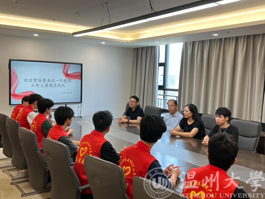 7月19日上午,学院党委副书记曾蓓蕾一行来到蜜桃视频 科技综合大楼九楼慰问学院正在进行社会实践的云智立暑期科创实践团队,学院辅导员潘龙飞和屠昌浩一起参加了慰问。蜜桃视频 云智立科创实践队指导老师吴平热情接待了曾蓓蕾副书记一行。