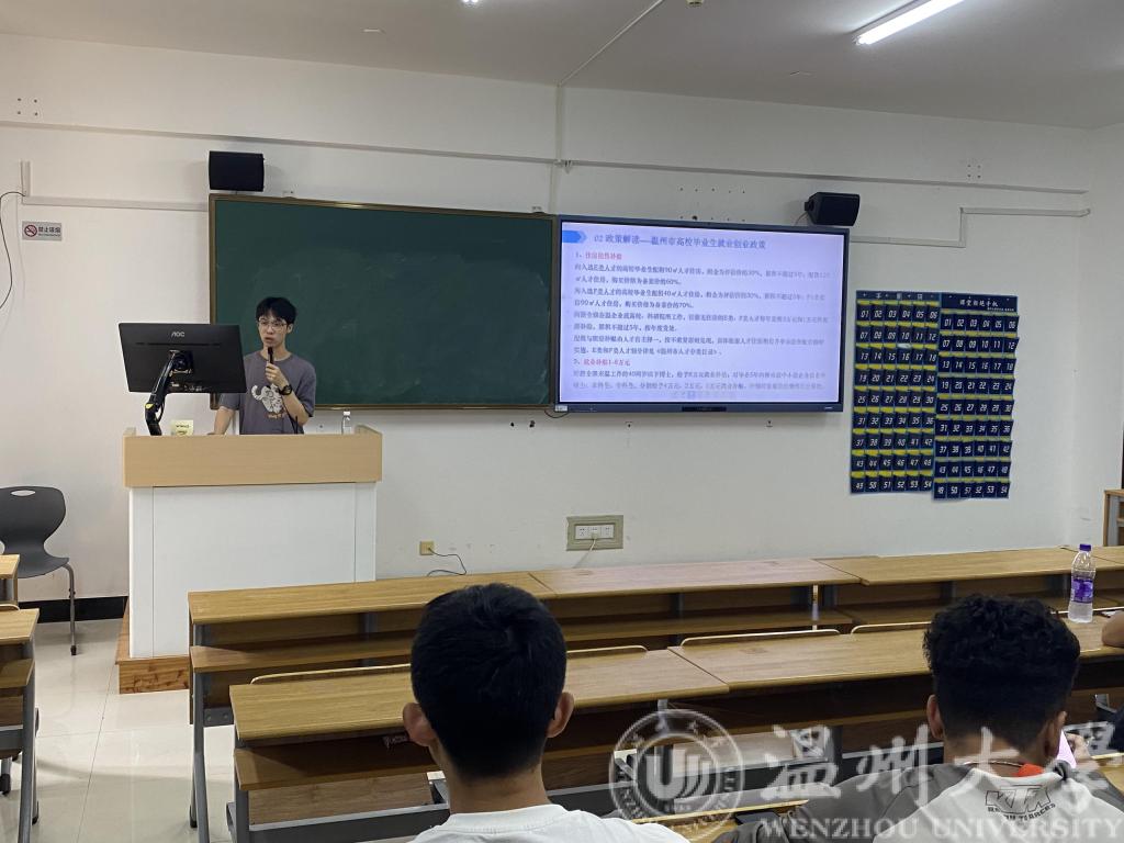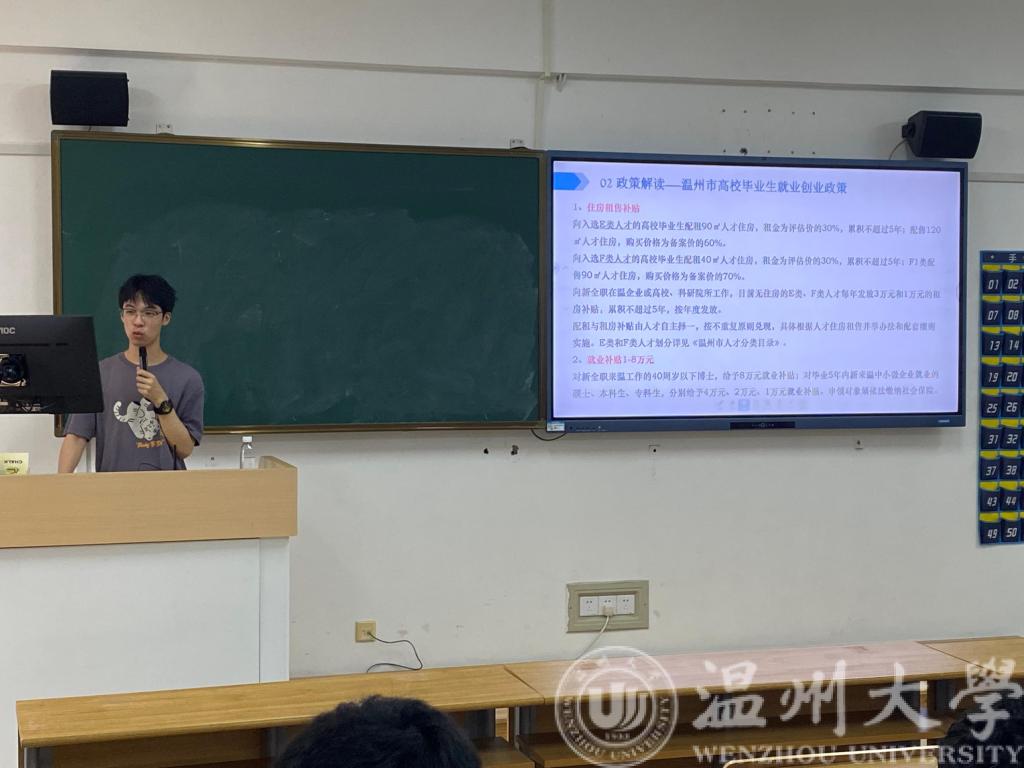 为帮助2024届毕业生了解温州市就业创业政策并顺利毕业,推动学院毕业生高质量就业,蜜桃视频 于9月至10月在学院1A207、1B402教室召开就业主题班会暨市情教育会,由蜜桃视频 就业辅导员屠昌浩为2024届所有毕业生详细介绍毕业要求、就业流程、温州市就业创业政策和毕业调查等内容,为毕业生解答毕业及就业过程中的相关疑惑。