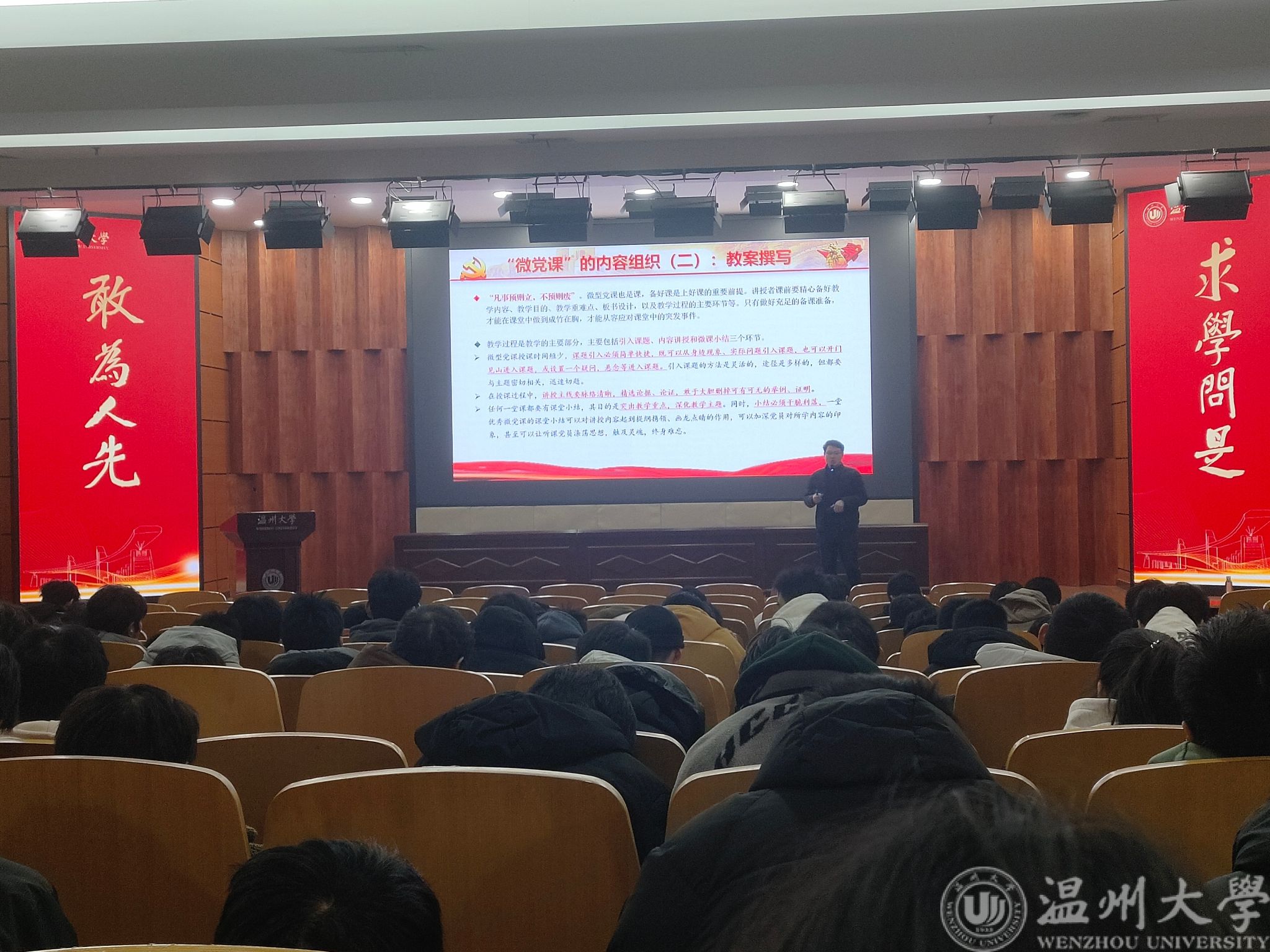 紧接着,潘龙飞老师从什么是思政微课,思政微课的特点优势、内容组织和细节处理四个方面进行阐述。他讲到微党课是顺应新时代而产生的一种党教新载体,是在较短的时间内,运用小的事例或实践来阐述、宣讲大的道理,给人以启发、启迪并产生共鸣的一种党课创新形式。一堂好的思政微课要具备短小精悍、主题突出、贴近实际、形式灵活等特点。思政微课要在坚持“党课姓党”的总原则基础上,所选题材要与时俱进,题材要接地气,以小见大,要贴近生活,建议从熟悉的身边事、身边人讲起。在讲座的过程中,他用丰富的案例讲解了思政微课的内容组织形式,阐述了思政微课的细节处理和注意事项。