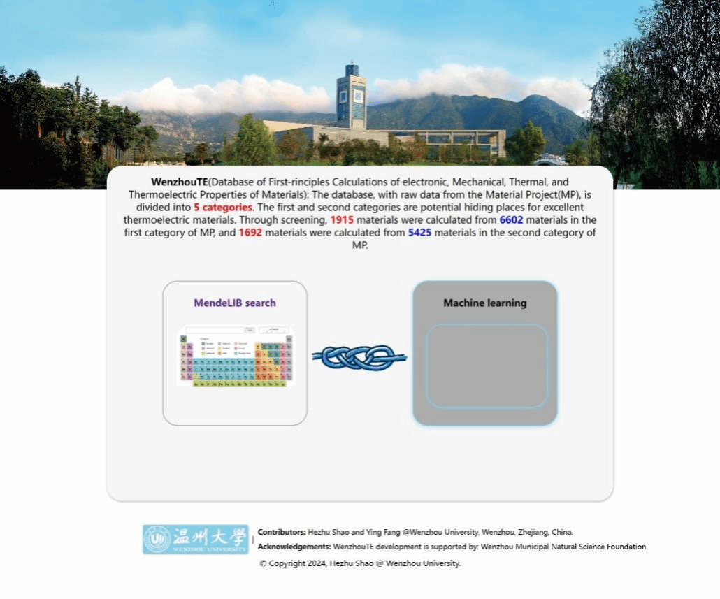 该工作得到温州市基础性工业科研项目(项目名称:基于材料基因组方法的高性能热电材料开发,项目号G20210016,项目经费:10万元人民币,其中财政支持5万元人民币,自筹5万元人民币,项目起止时间2022.1至2024年.12)的支持,另外蜜桃视频 也为课题组在计算服务器(目前建有10个计算节点)搭建上提供了大力支持,因而该材料数据库命名为“温州热电”(Wenzhou TE)。