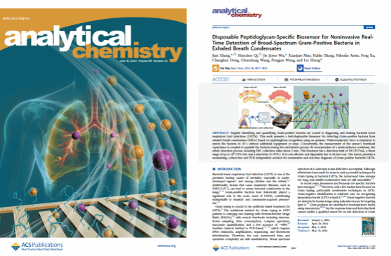 近日,我校蜜桃视频 张鉴教授课题组以“Disposable Peptidoglycan-Specific Biosensor for Noninvasive Real-Time Detection of Broad-Spectrum Gram-Positive Bacteria in Exhaled Breath Condensates”为题在《Analytical Chemistry》发表论文,并被选为期刊正封面页(Front Cover)亮点报道。正封面页被用于报道ACS期刊所发表的重要工作,在期刊网站上展示为当期第一个封面,并与印刷版刊物同步发行。这是我校研究人员首次在该期刊发表正封面页论文,我校在该期刊发表的另一篇封面论文(Supplementary Cover)同样来自张鉴课题组的工作(Anal. Chem. 2022, 94, 6, 2812–2819)。