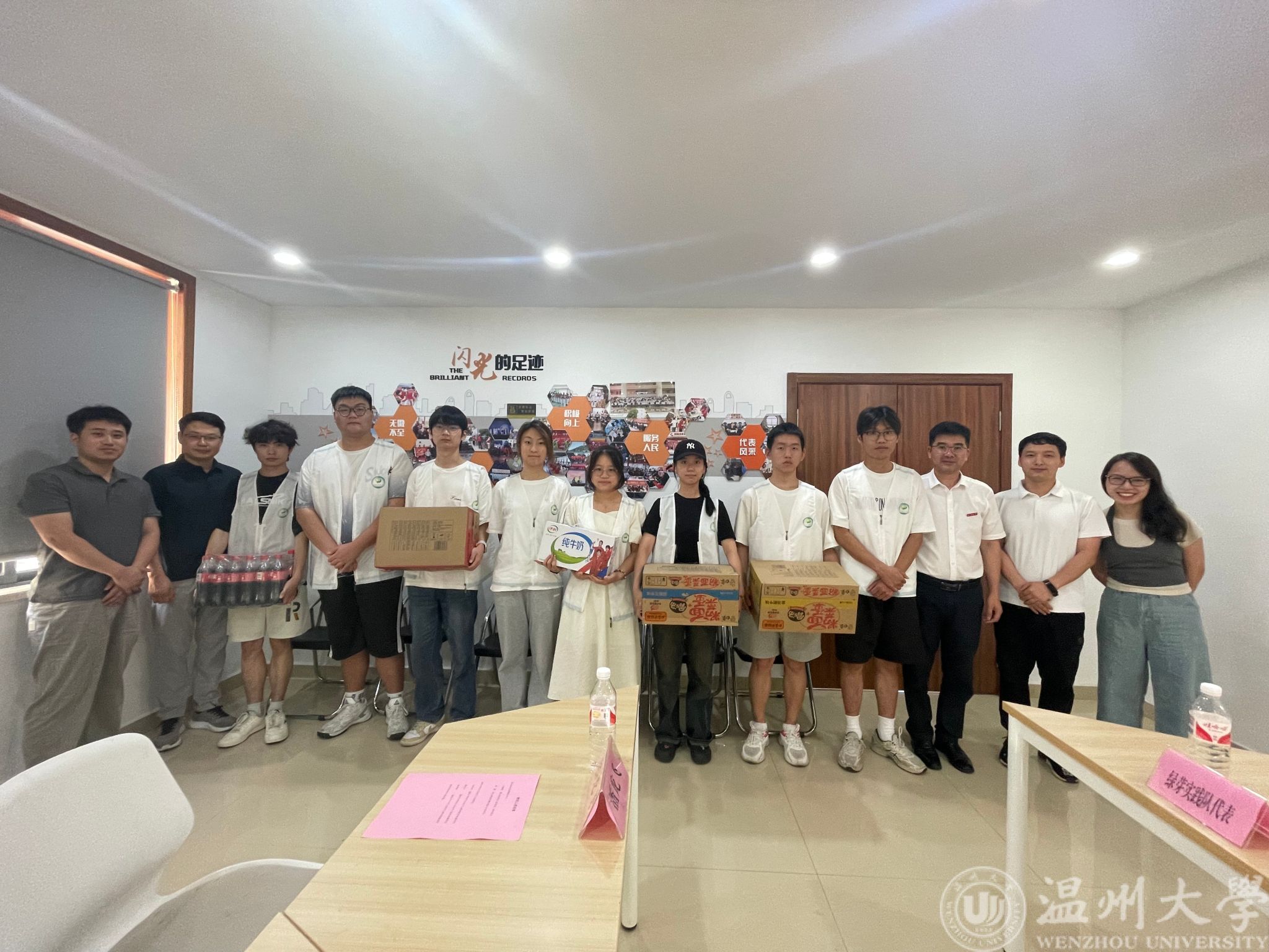 (王中对副书记一行向绿芽实践队队员赠送慰问品)