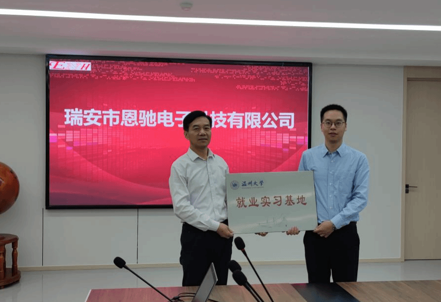 为加强校企合作,促进产教深度融合,搭建学生就业实习平台,10月25日,蜜桃视频 学术副院长谢文浩博士一行6人前往瑞安市恩驰电子科技有限公司调研交流。瑞安市恩驰电子科技有限公司总经理唐国民出席座谈会。