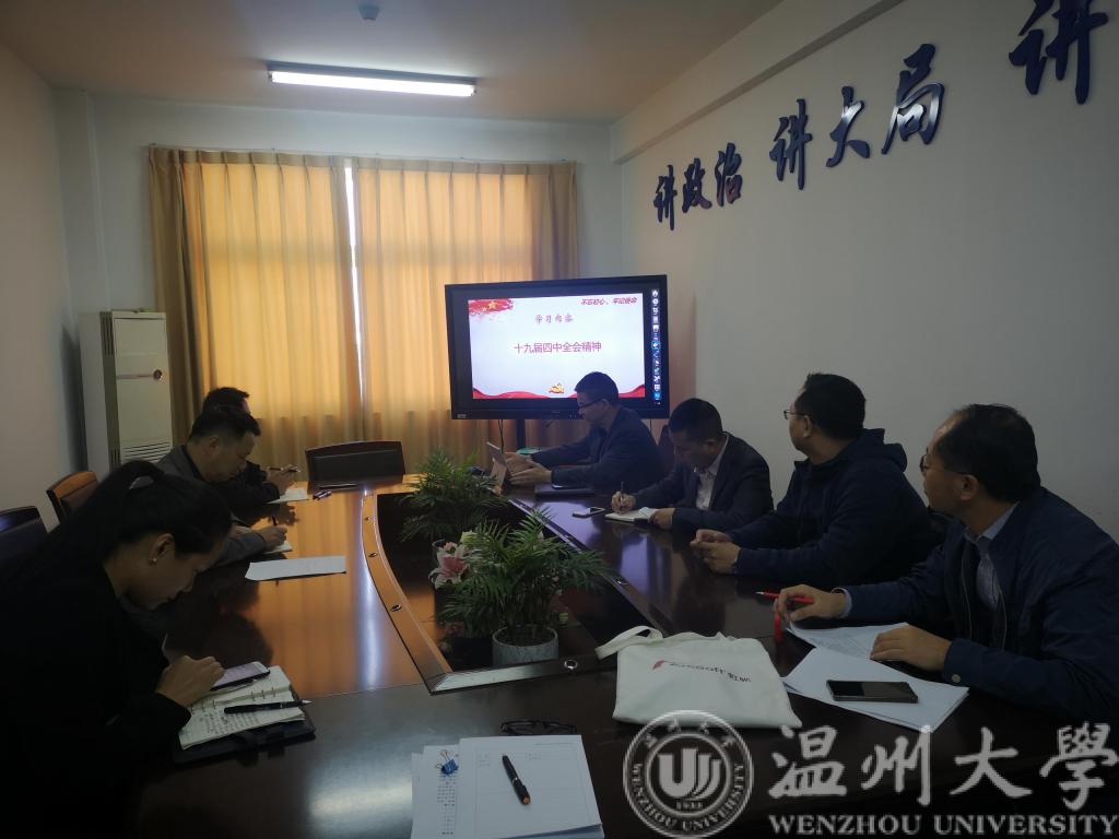 11月15日上午,蜜桃视频 党委理论中心组在1A594召开本学期第四次学习会,学院全体班子成员和党委委员参加了学习会议。学习会由学院党委书记李方强主持。本次学习会集中学习党的十九届四中全会精神。