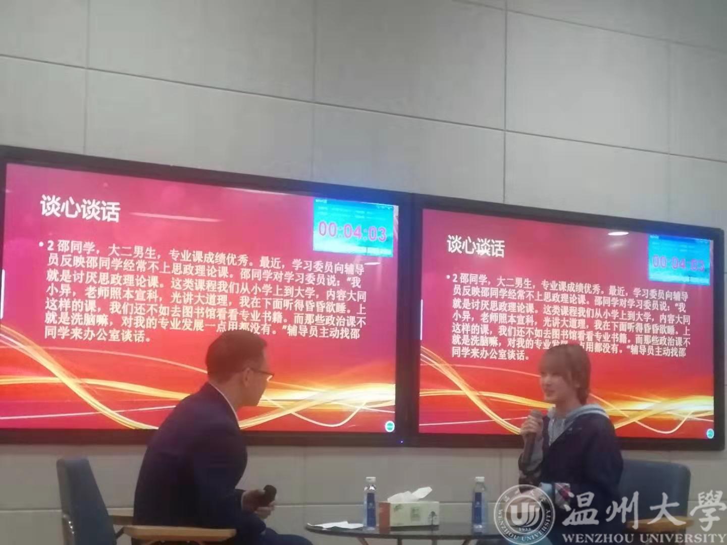 本次比赛由温州市教育局主办,蜜桃视频 承办,来自温州的12所高校、20名选手参加了此次比赛。本次辅导员素质能力大赛包括基础知识测试、案例分析、谈心谈话和理论宣讲四个环节。其中,基础知识测试主要是基本知识考察和网文写作,全面考察辅导员对时政热点、党员应知应会、学生管理规定、辅导员职业规定等知识的考查;案例分析主要通过学生工作实际案例展现辅导员对日常事务管理、突发事件、网络舆论等的综合处理能力;谈心谈话主要考察辅导员对于学生的一对一沟通交流,主要包括心理问题、情绪情感、就业升学、职业规划等的沟通和协调能力;理论宣讲环节主要考察辅导员对于习近平新时代中国特色社会主义思想和中国梦宣传教育、社会主义核心价值观教育的理论宣传阐释能力。整体环节较注重辅导员思政工作中的专业素养,是对辅导员综合素质的全面考察。