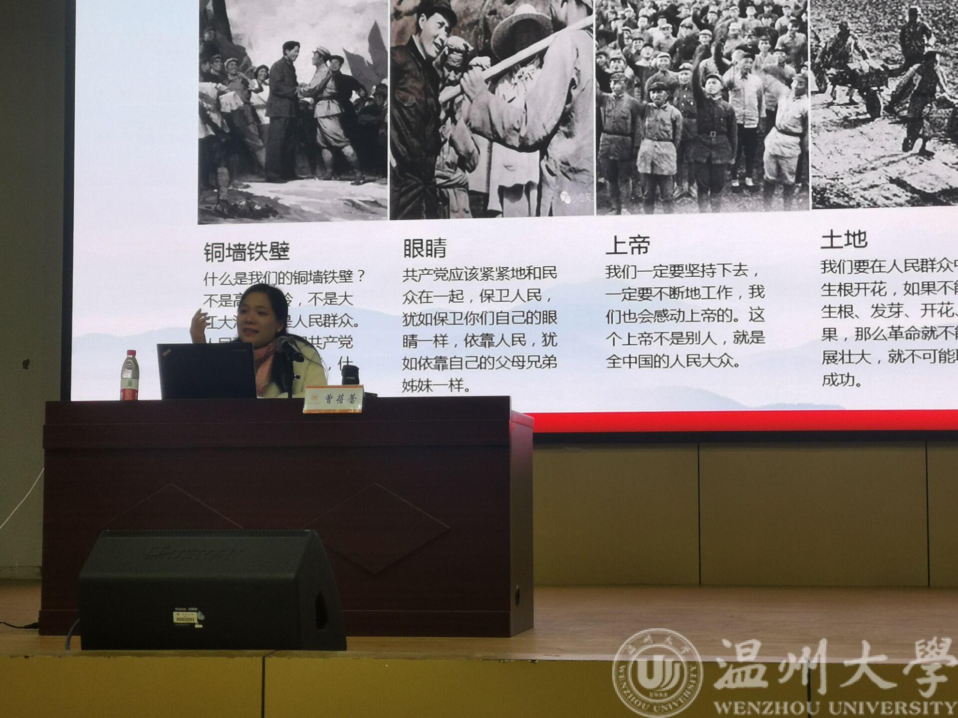 2019年12月19日晚,蜜桃视频 在南校区九号楼报告厅开展了形势政治讲座,本次讲座的主题是"中国共产党人的初心和使命七问",由学院党委副书记曾蓓蕾老师主讲。