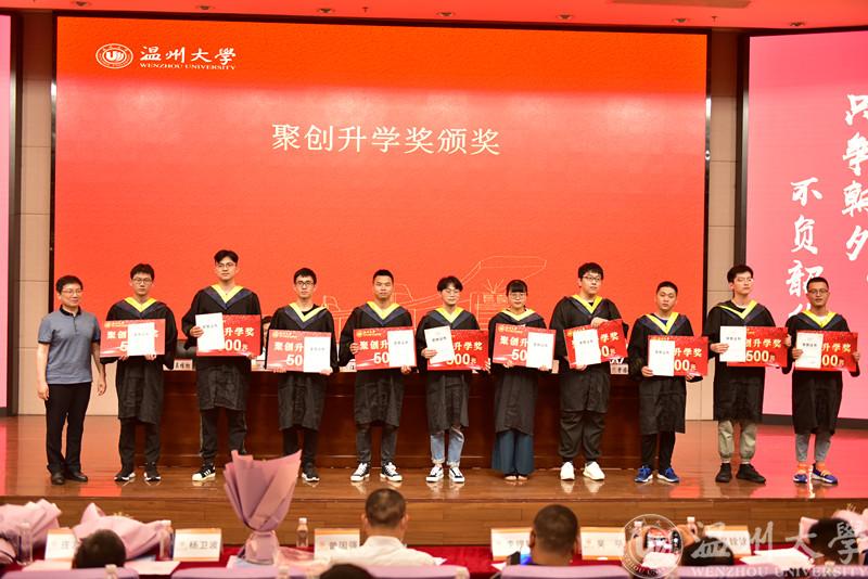 毕业典礼的第二环节,进入聚创升学奖颁奖仪式,由副院长陈孝敬宣读获奖名单,聚创公司董事长、学院资深教授吴桂初老师对获奖同学(共58人)一一进行颁奖。