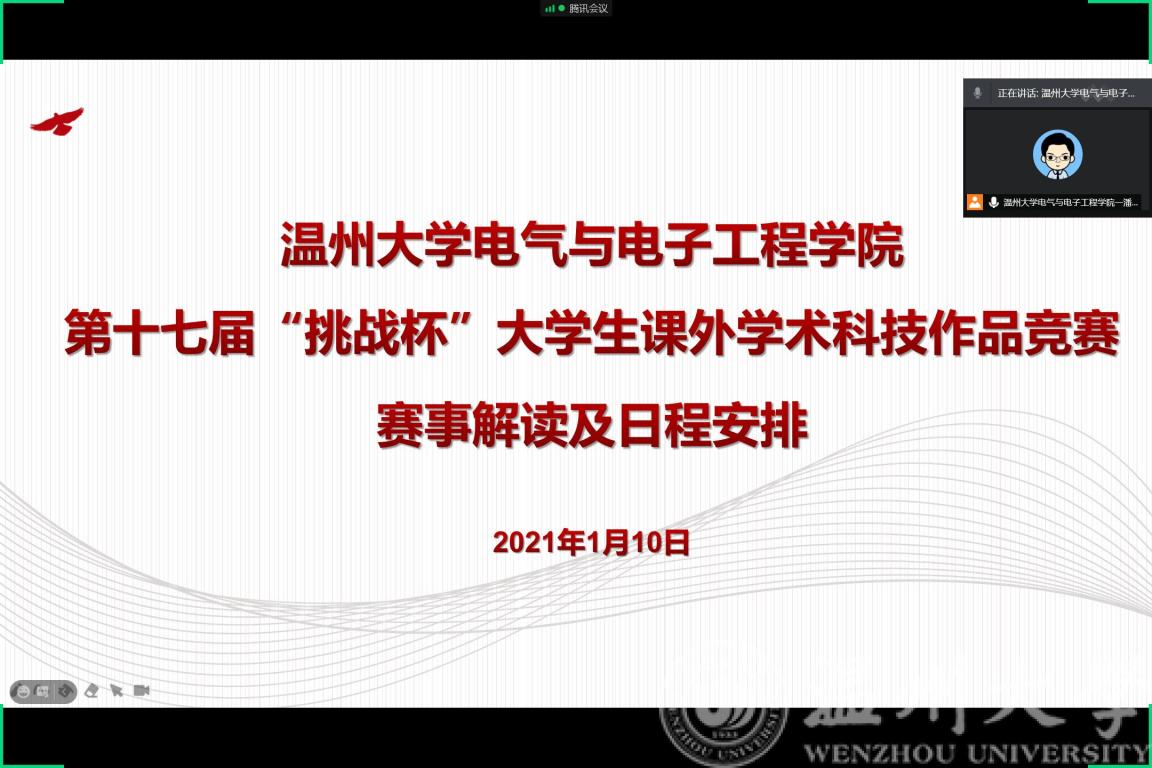 为及时传达1月8日校团委召开的“第十七届‘挑战杯’大学生课外学术科技作品竞赛赛事动员大会”的会议精神,进一步提高蜜桃视频 师生参与大赛的热情,更好的为师生答疑解惑,1月10日晚18:30,蜜桃视频 召开“第十七届‘挑战杯’大学生课外学术科技作品竞赛赛事解读及日程安排”线上会议。学院院长汪鹏君、党委副书记曾蓓蕾,及预参赛项目的学生和部分指导老师参与了此次会议,会议由学院负责科创工作的辅导员潘龙飞主持。