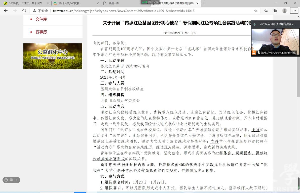 本次会议由潘龙飞老师主持。首先,潘龙飞老师呼吁全院学生以建党100周年为契机,积极通过社会实践接受红色教育、体悟红色文化和党的红色精神伟力,感受我国经济快速发展和社会长期稳定的奋斗历程。鼓励积极参与红色专项社会实践活动,并就关于开展“传承红色基因 践行初心使命”红色专项社会实践活动的通知做了详细的安排和规划;最后,由丁佳洁老师提出了本次红色专项实践活动的具体注意事项,并向班委们征求了相关意见和建议。