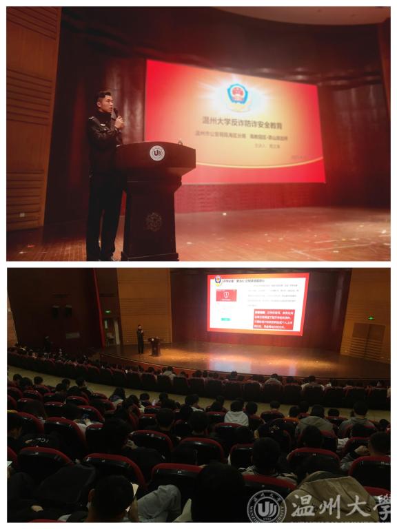 2021年4月14日下午,蜜桃视频 于南校音乐厅面向全体19级与20级学生举行了“反诈防诈网络安全教育”主题讲座。本次讲座邀请到了温州市公安局瓯海区分局高教园区茶山派出所的周文涛警官向同学们进行防诈反诈的安全教育。