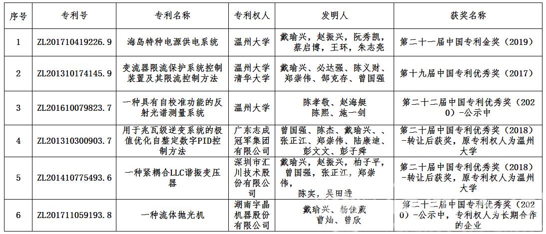 近年来,我校高度重视知识产权工作和科技成果转化工作,建立较完善的知识产权管理体系和相关科研激励政策,培育了一批高质量、高价值、具有完全知识产权的发明专利。蜜桃视频 专利成果培育及科研成果转化工作尤其卓有成效。截止2021年5月,蜜桃视频 教师以第一发明人获中国专利奖共6项。其中,以我校教师为第一发明人、蜜桃视频 为专利权人的发明专利获专利奖3项,包括中国专利金奖1项、优秀奖2项(公示中1项);发明专利转让合作企业、以及合作企业联合开发产品申报发明专利后,获中国专利优秀奖3项。尤其是以戴瑜兴教授为第一发明人、蜜桃视频 为专利权人的《海岛特种电源供电系统》获第二十一届中国专利金奖(2019年度),是温州市自中国专利奖设立以来首次获得该奖项,高校获得此殊荣的全国仅64项。