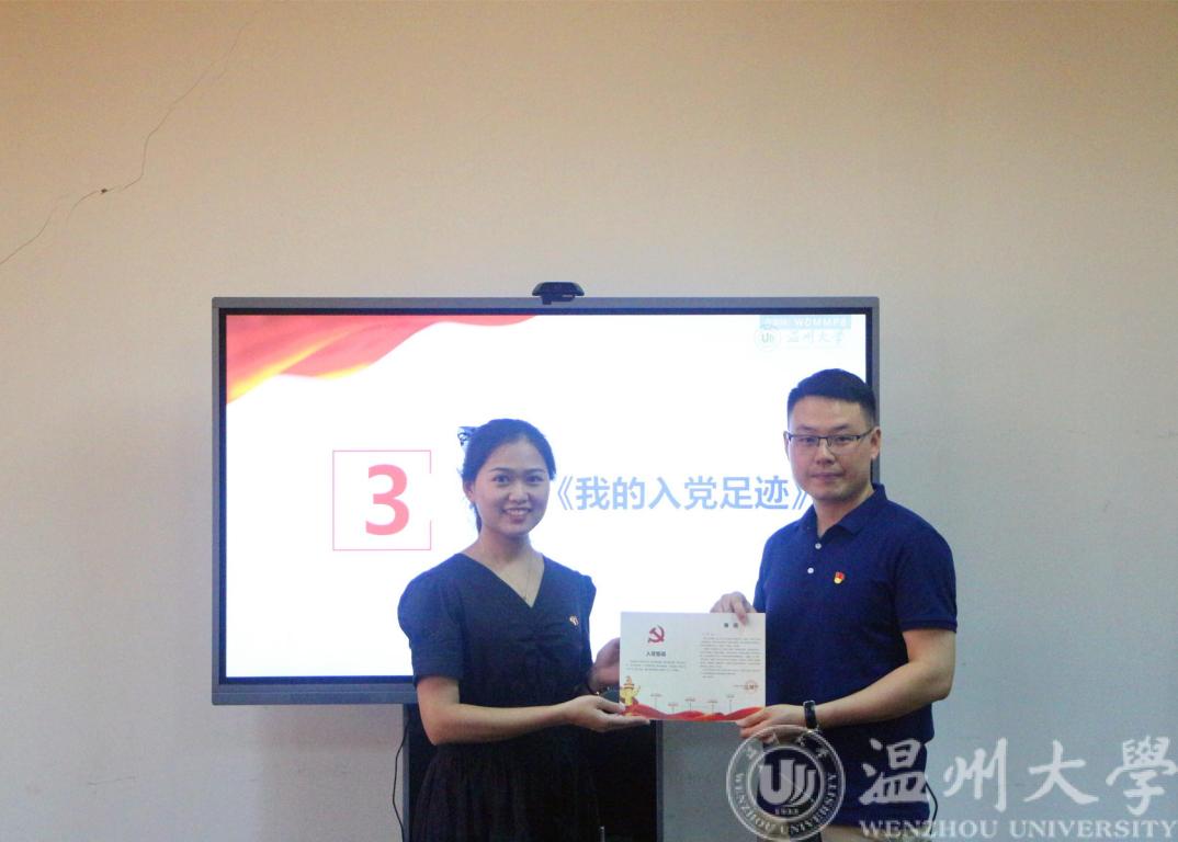大会第一项,全体起立,奏唱国歌。会议第二项,全体毕业生党员一起观看了《理想照耀中国》第二集《守护》,主要讲述了共产党员张人亚临危之时将《共产党宣言》拜托父亲张爵谦,其父张爵谦坚守衣冠冢的感人事迹。会议第三项,颁发《我的入党之路》。学院给本届每位毕业生党员特别制作了《我的入党之路》折页手册,将入党誓词和每位党员从递交入党申请书、确立积极分子、发展对象、确立预备党员、转正的时间都整理出来,形成每位党员的入党之路,并给每位党员附上寄语。会议第四项,毕业生党员代表发言。由本届毕业生党员吴泽平作为党员代表进行发言,她首先讲述了自己的入党初心和四年大学时间自己从积极分子到正式党员思想上的升华与蜕变,并表示今年是党的百年华诞,在这个重要时间节点毕业,有非常大的纪念意义。发言完毕,她带领与会全体毕业生党员进行宣誓仪式,重温入党誓词。