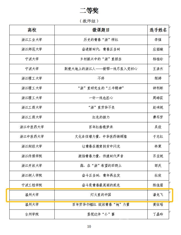 近日,由共青团浙江省委、浙江省教育厅、浙江省学生联合会主办的2020年度浙江省高校思政微课大赛获奖名单公布,蜜桃视频 辅导员潘龙飞老师的思政微课作品《灯火里的中国》荣获此次微党课大赛二等奖。