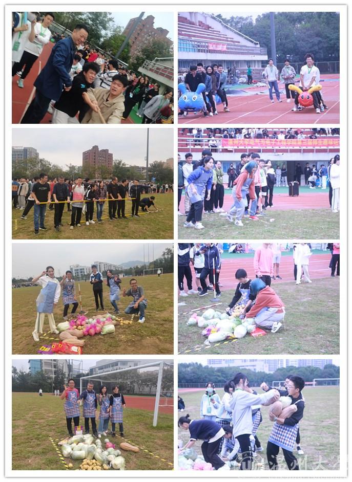 紧接着是学院精心策划的劳动竞技项目是“粮食保卫战”。“春生夏长,秋收冬藏”,秋天是忙碌的季节,亦是丰收的季节。每组四人参赛,两名男生与两名女生。根据每支队伍运回的粮食品种和数量,换算成一定的积分。巨大的场地让每名队员的跑动都很吃力,不过大家还是坚持到了最后。比赛结束后,师生们分享到说:“我们在比赛的时候,不仅要争夺粮食,也要保护好粮食。特别是白花花的大米,一粒粒米累积也影响农民的收成,比赛让我们知道该怎样珍惜粮食。”第三个项目是“旋风跑”。每队八人,每名队员都要将双手握在一根杆子上,一起绕着标志杆转圈跑。这个项目的活动看似简单,但跑起来却大有难度。问题的关键在于位于杆子两端的同学,他们需要进行长距离的跑动,在绕圈的时候一个没抓紧就会被甩出去。当然,位于中间的同学也很重要,他们需要调整自己与排头之间的步伐,尽可能的让两端的队员跑的轻松。每队队员跑完之后都大口喘气,这个项目确实很累,但是它也促进了队员们相互理解,相互包容,相互鼓励。最后一个项目就是众人期待的拔河比赛了。在同学们的急切盼望下,比赛即将开始了。各班的运动员精神抖擞地上了阵,双手紧紧地抓住大麻绳,只等裁判员的号令。哨声一响,同学们死努力地往后拉。在大家齐心协力下,绳子中间的红带子慢慢向一边移动了。场边的同学们高兴地大声地加油助威,双方都不甘示弱……所有参赛队伍都很尽兴,在结束与对手的较量之后也都面带笑容的鼓励对方。