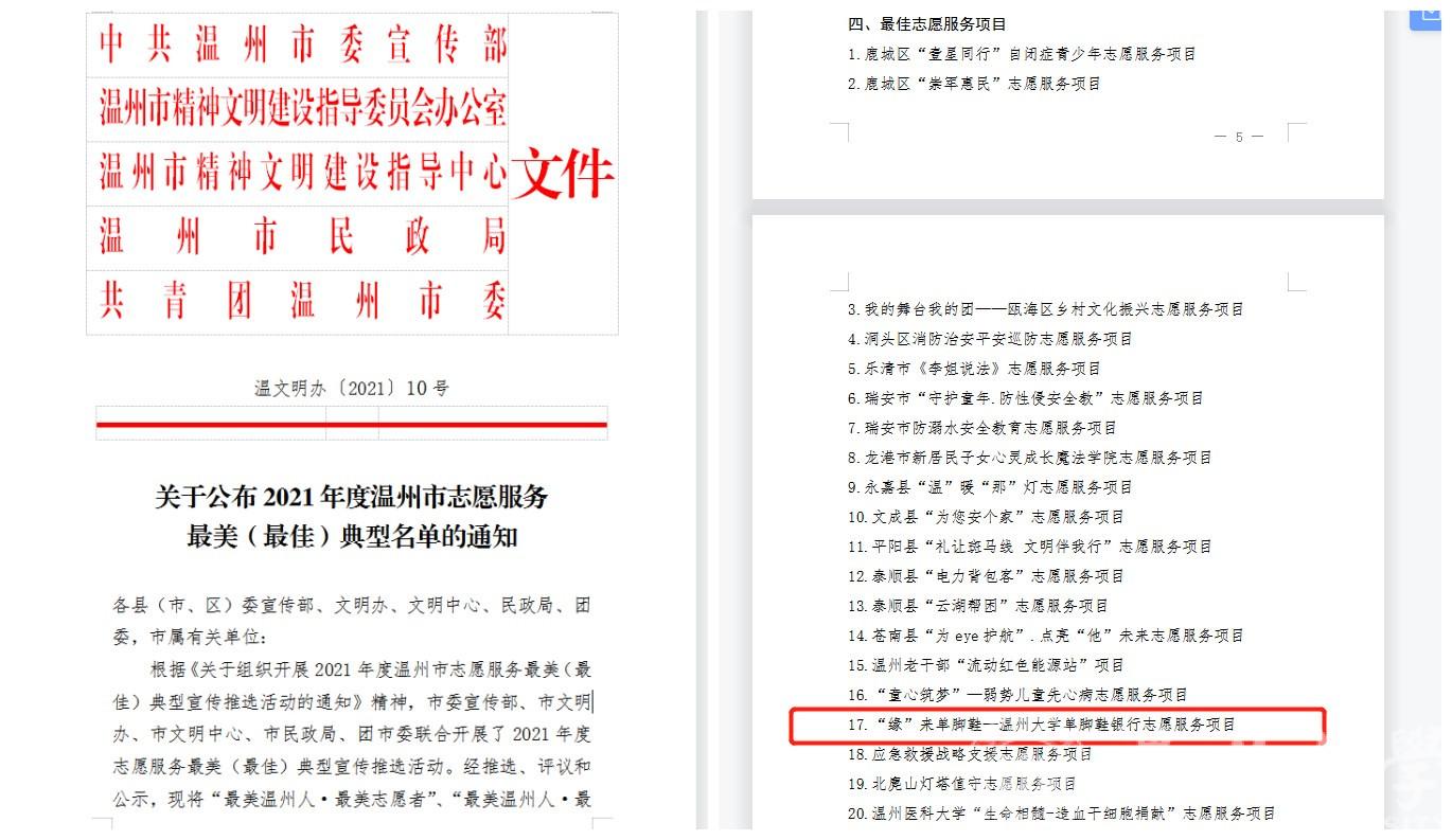 2021年度温州市志愿服务最美(最佳)典型名单于11月25日公布,经过学院推荐、社会评议,蜜桃视频 “单脚鞋银行”师生志愿者服务项目荣获温州市最佳服务项目奖。