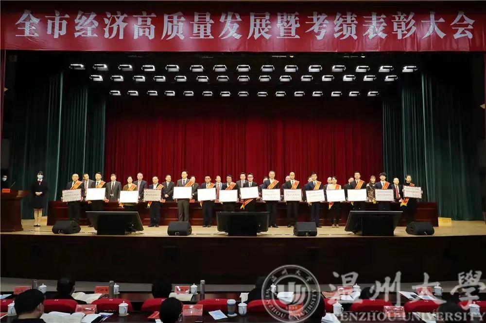 会议观看了《乐清市经济高质量发展专题片》,表彰了考绩优秀单位、先进企业及2021年政策兑现项目相关企业。会上公布的多个荣誉榜单中,蜜桃视频 乐清工业研究院在“温州市高能级创新平台”榜单光荣上榜,研究院院长林振权上台接受乐清市政府颁发荣誉奖牌。市委书记徐建兵充分肯定了过去一年各先进部门、企业的成绩,鼓舞广大企业勇于担当,积极贡献。