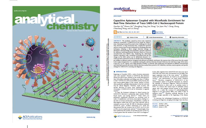 近日,我校蜜桃视频 张鉴教授课题组以“Capacitive Aptasensor Coupled with Microfluidic Enrichment for Real-Time Detection of Trace SARS-CoV‑2 Nucleocapsid Protein”为题在《Analytical Chemistry》发表研究论文,并被期刊选为supplementary cover亮点报道。