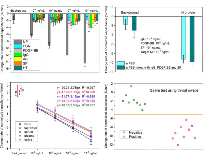 我校蜜桃视频 张鉴教授课题组基于微流控富集和核酸适配体特异性识别机制,以病毒的核衣壳蛋白(N蛋白)为抗原,利用微加工传感器的pF级界面电容感应原理,实现了一种低成本、非标记、非测序的痕量新冠病毒标志物检测芯片及检测策略。N蛋白作为SARS-CoV-2的一种重要结构蛋白,在病毒RNA的组装和释放中起着关键作用,是一种理想的检测靶标。通常的抗原检测方法对痕量蛋白依赖额外的预富集装置及步骤,不易实现实时检测。课题组利用交流介电泳力驱动,在15秒内完成超痕量N蛋白的富集,同时巧妙利用界面电容变化率,在同一过程中完成传感信号读出。该传感器的检出限低至10-6 ng/mL,较之大部分已报道结果低4个数量级,线性范围为(10−5 ~ 10−2 )ng/mL,检测时间为15秒钟。课题组利用该传感器对血清、血浆、唾液、环境水等多种基质中的N蛋白进行了成功检测。