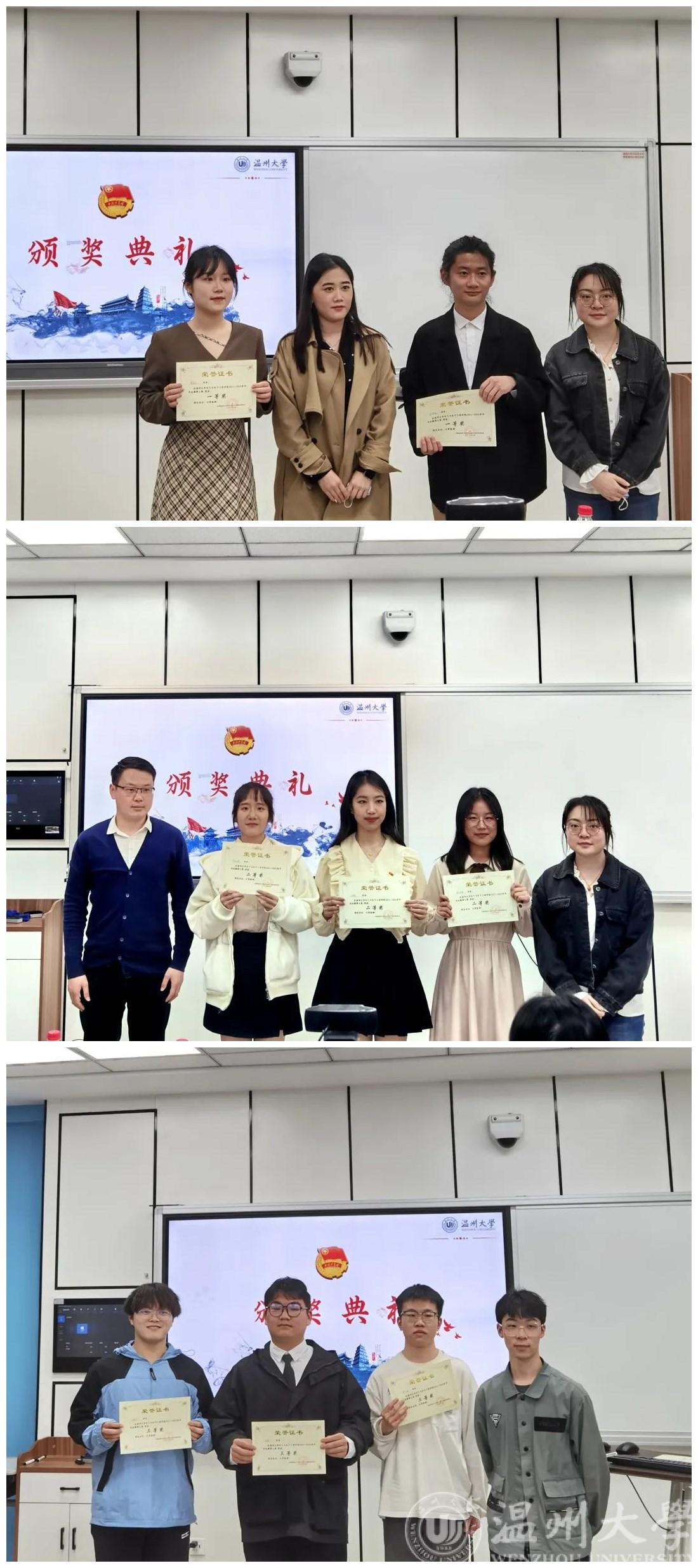 在比赛过程中,选手们围绕自己对主题的理解,联系国家发展路程,阐述了建党百年辉煌历程中的奋斗故事。有的以红色故事为切入点,重走长征路,重温父辈魂;有的深入挖掘浙江精神,发扬了勇立潮头的弄潮精神;有的挥洒热血,誓将青春燃作引火棒;有的以冬奥着手,以“五位一体”赋能冬奥,展现00后青年的风采……15名选手依次进行展示,展示结束后,评委老师依次进行打分。最终,周佳莼等6位选手获得本届思政微课大赛的一等奖,金瑞等9位选手获得二等奖。参赛选手们都表现出色,阐述了自己对相应主题的出色独到的理解,他们也用慷慨激昂的演讲感染了观众,锻炼了自己,也得到了评委老师们的肯定。