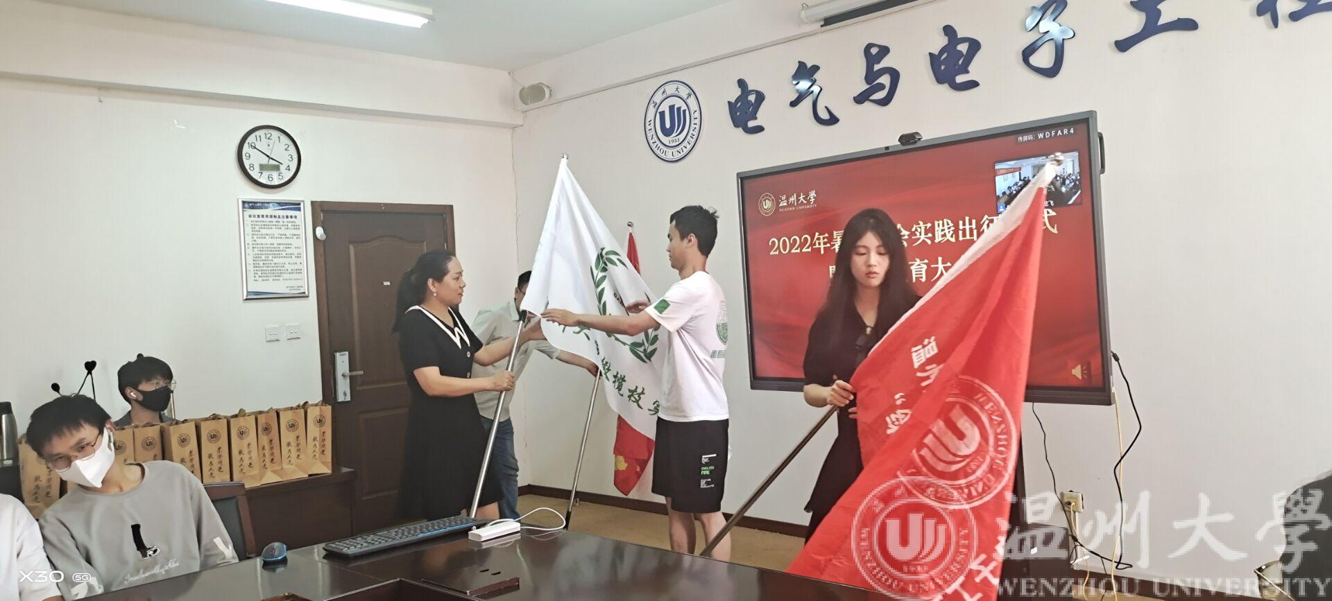 紧接着是授旗仪式,由曾蓓蕾书记给全体实践队代表颁发旗帜,暑期社会实践活动的号角正式吹响。