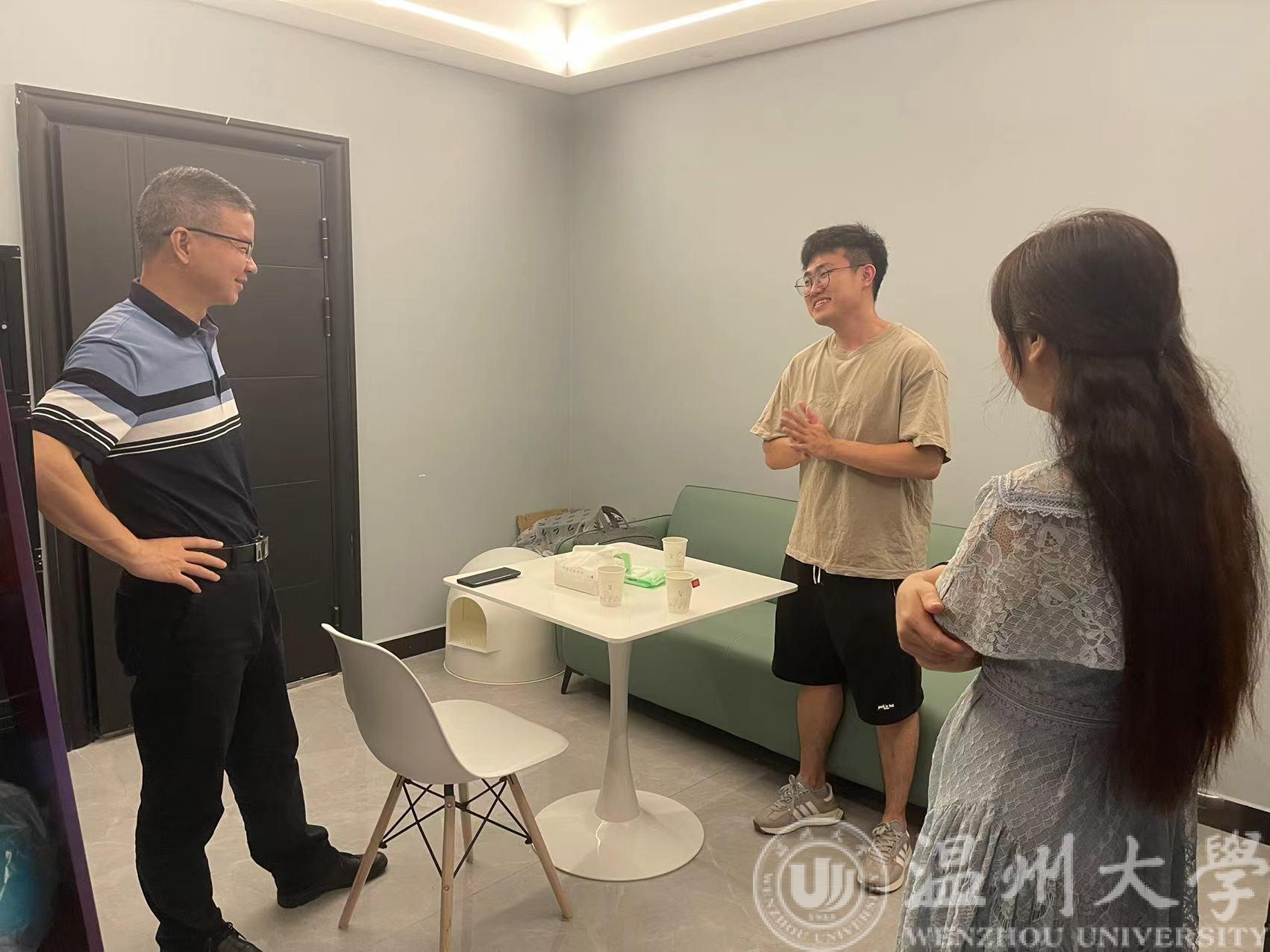 走访中,李方强书记与新进教师进行亲切交谈,关心他们的住宿和生活情况,还适应新的工作环境吗?工作、生活上有没有困难?出行是否便利?这些简单、亲切的话语让新教师们倍感温暖!随后,查看了公寓的家具配置、厨卫设施、空调水电等,耐心的听取新进教师们的心声及他们的生活、工作情况。