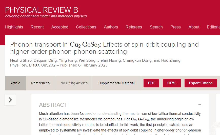 据悉,《Phys.Rev.B》是美国物理学会(American Physical Society)主办的物理学术期刊之一,主要刊登凝聚态物理领域高水平前沿学术成果,在国际物理学界享有高度学术声誉,是自然指数(Nature Index)收录的全球82个顶级期刊之一。