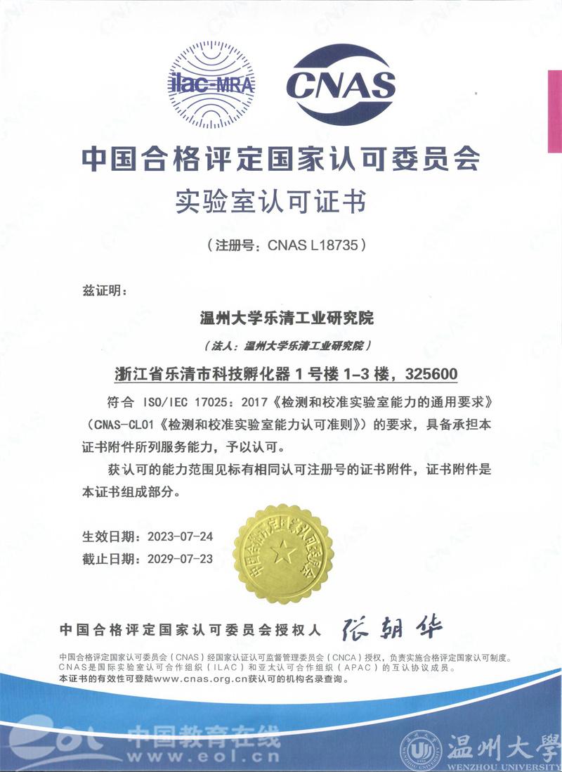 2023年7月,蜜桃视频 乐清工业研究院喜获CNAS、CMA证书,助力电气产业产品研发测试创新能力提升!