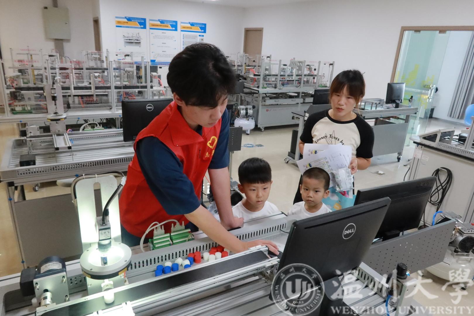 在实验室,云智立实践队利用先进的工业设备,向孩子们普及了智能制造的基本知识和应用领域,介绍了智能制造在工业和社会各个领域的应用案例和发展前景,通过队员们的讲解和现场观看,孩子们操作智能设备,加深对智能制造的理解和实践,科研的种子在心中生根发芽。