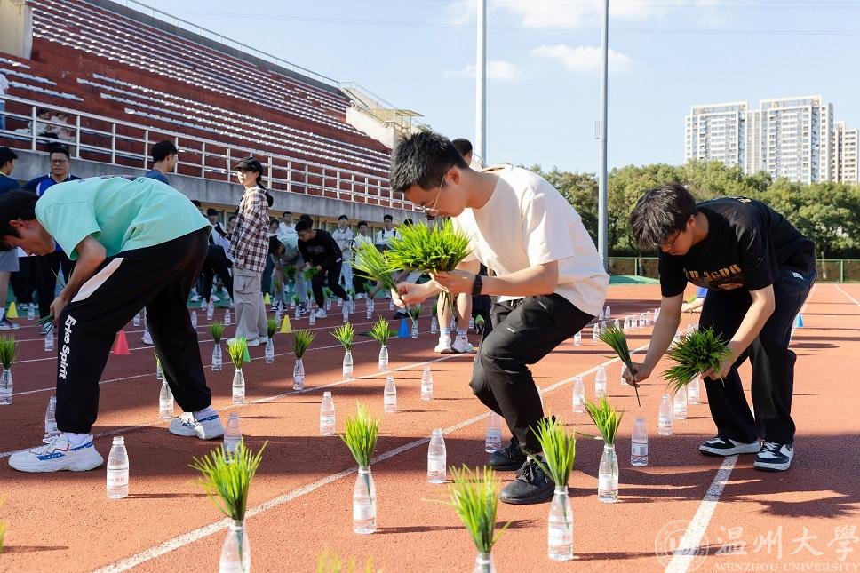 整地完毕,就要开始播种了。“插秧小能手”模拟了田园插秧的步骤,师生们在特别的“田地”上又快又准地将“秧苗”插入“田地”。