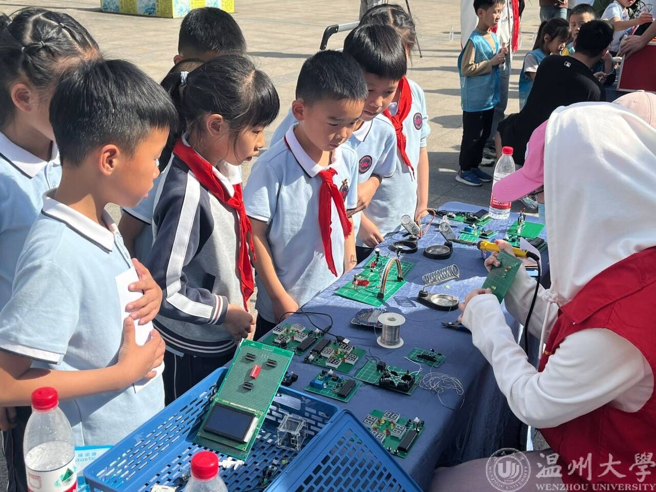 元器件文创体验组向同学们展示了电子元器件工艺品,并普及了科学小知识。创新之道,惟在得人,“原来小小的电子元器件,有着大大的功能,我们的生活都离不开他们,”孩子们看到电子元器件兴奋地说。在大学生志愿者们的指导下,孩子们拿起电烙铁,沉浸式地体验了一把“电焊师”的感觉。