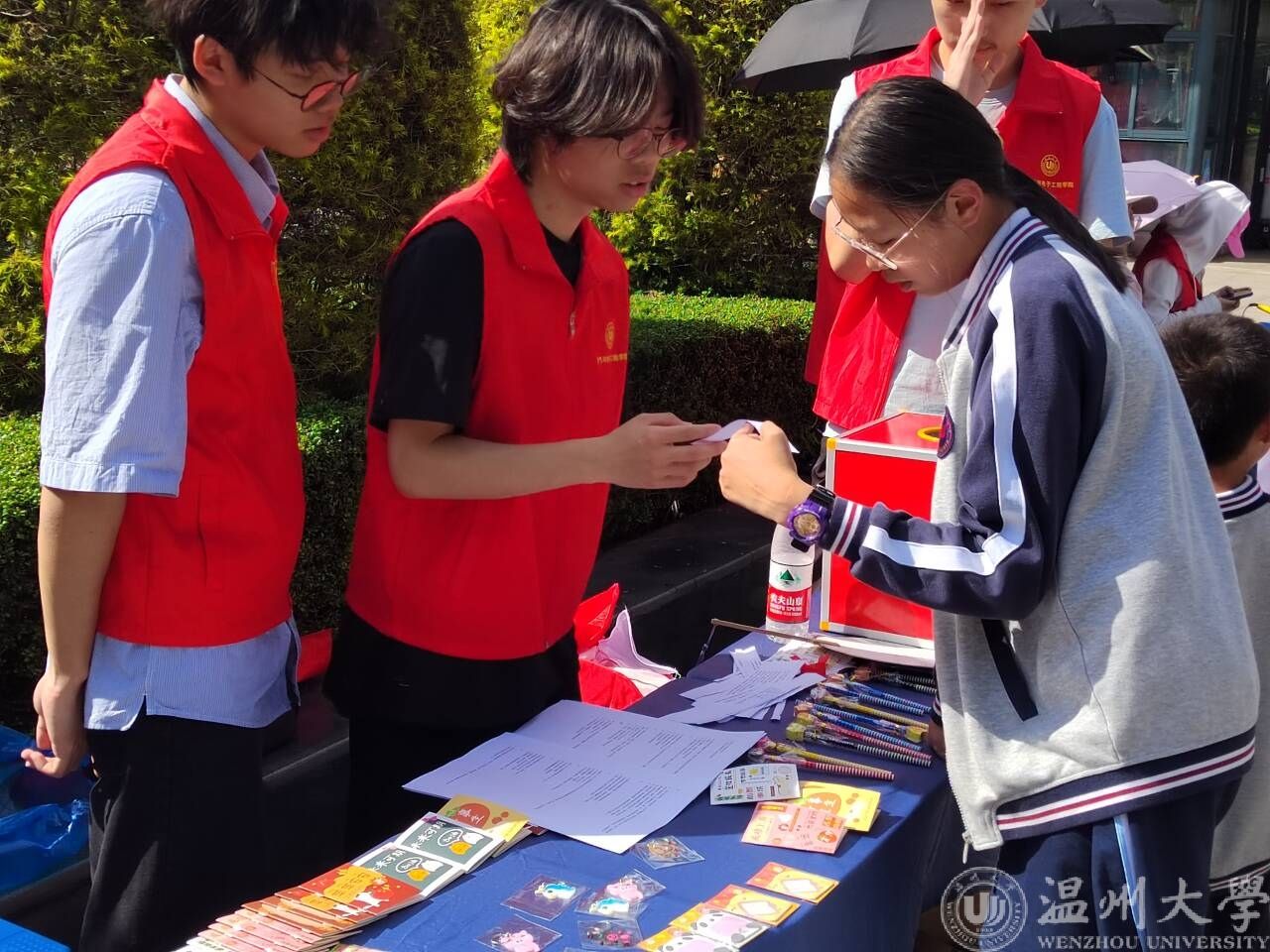 活动现场热闹非凡,学生们争先恐后一脸兴奋地穿梭在每一个集市摊位上,各个集市摊位被围得水泄不通,穿着红马甲的志愿者们一边维持秩序,一边引导同学们进行不同领域的全新体验。