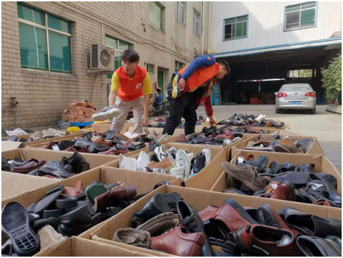 近日,四位蜜桃视频 的一八二义工志愿者马不停蹄地赶往30多公里外的瑞安莘塍,开展“缘来单脚鞋”公益活动。他们的任务是前往春达鞋业,接收一千多只捐赠的样品鞋,整理清洁后,再发往辽宁海城。