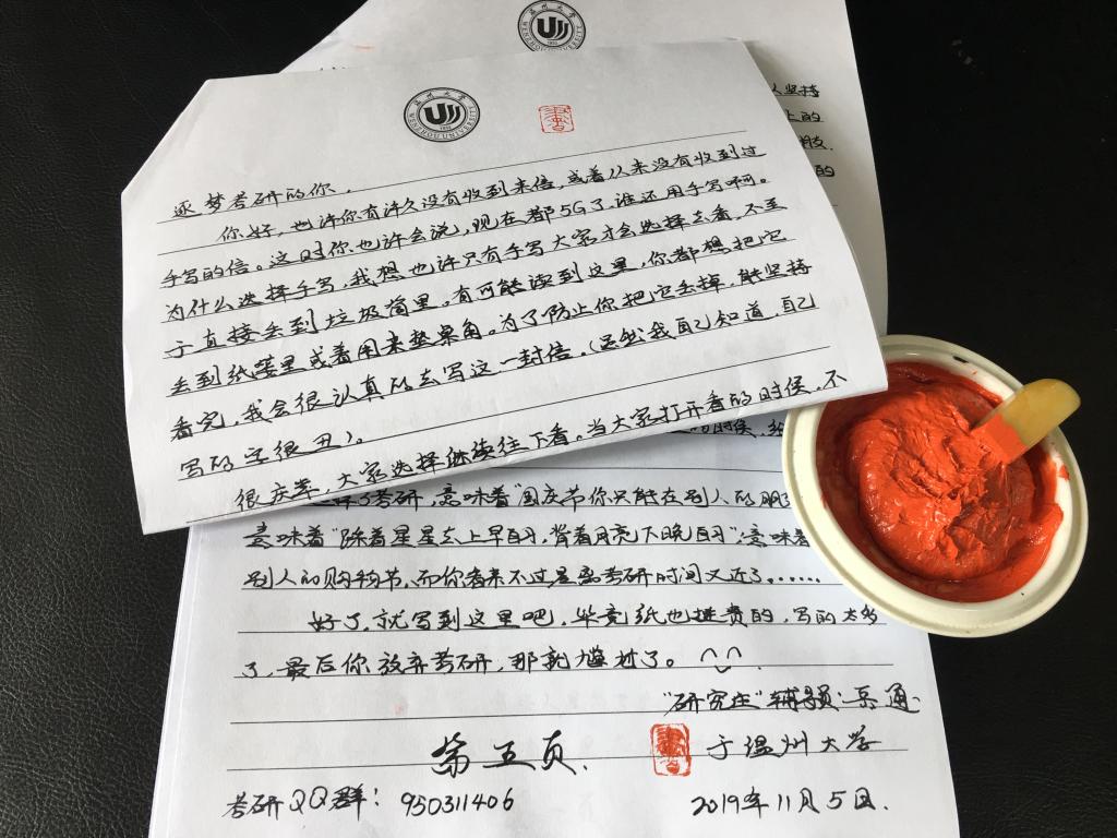 这封信的“始作俑者”,是蜜桃视频 的辅导员岳通通老师。手写信的内容从为什么考研、考什么、怎么准备、如何报考等方面进行了阐述,里面还结合自身考研经历,鼓励大家积极报告,语言诚恳有力、幽默风趣。