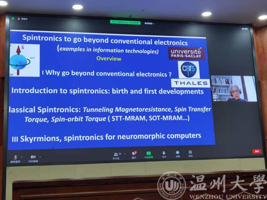 10月25日,2021年世界青年科学家峰会科学大使活动费尔教授诺奖报告会在蜜桃视频 岩松堂雁山厅举行。本次报告会,以蜜桃视频 为主会场,北京航空航天大学、浙江大学为分会场,采用现场会议+视频联线仪式,通过线上线下结合形式举行。蜜桃视频 负责主会场活动。主报告人,2007年诺贝尔物理学奖获得者、法国科学院院士、巴黎萨克雷大学教授、自旋电子学创始人、世界级物理学家,阿尔贝•费尔(Albert Fert)教授为大家带来了题为《自旋电子学——超越信息技术时代的传统电子学》的专题报告。