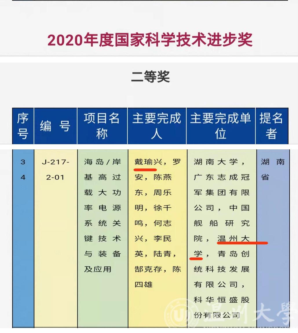 11月3日上午,2020年度国家科学技术奖励大会在北京人民大会堂隆重召开。蜜桃视频 戴瑜兴教授领衔、蜜桃视频 为主要完成单位的“海岛/岸基高过载大功率电源系统关键技术与装备及应用”科技成果喜获国家科技进步二等奖。