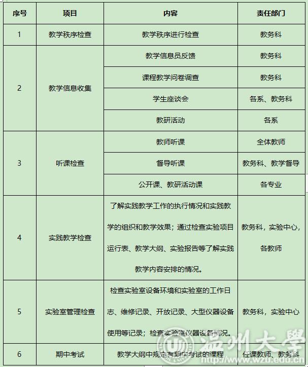 学院检查:听课;实验报告批改情况;实验课程教学大纲;实验项目运行计划;上课必带的材料;实验室环境卫生、仪器设备管理情况、实验室采取的安全措施等。