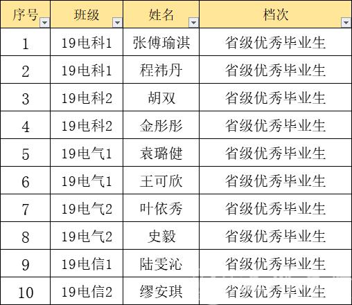 根据《蜜桃视频 优秀毕业生评选办法》(温大行政发[2020]104号),按照学校初次分配名额,根据前期进行2023届省级优秀毕业生的预评选,推荐19电科1张傅瑜淇 等10名同学获得省级优秀毕业生荣誉称号,现将名单进行公示。