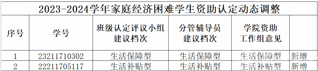 根据《蜜桃视频 家庭经济困难学生认定办法》(温大行政〔2020〕37号)文件精神,结合实际情况,经学生个人申请,学院初评,对2位同学进行资助认定或动态调整工作。现将名单予以公示,公示期五个工作日,如有异议请于公示期内与学工办(1A-521)联系,具体认定档次以学校公示为准,特此说明。