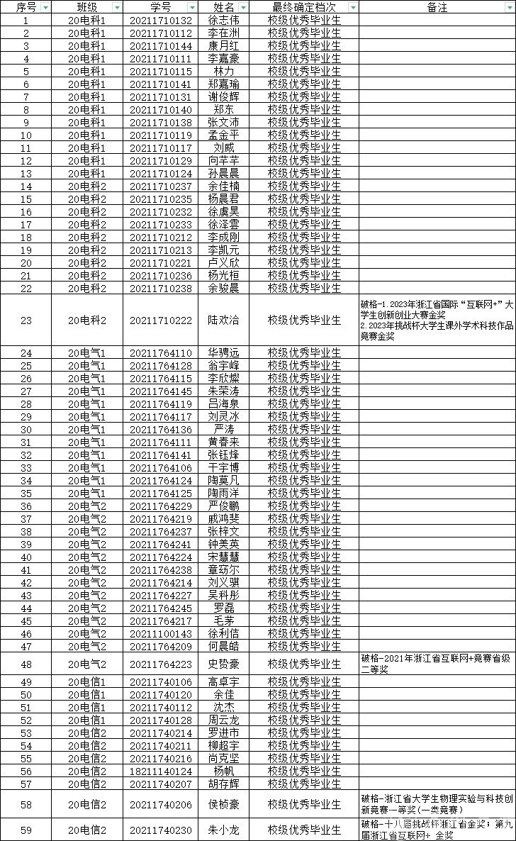 根据《蜜桃视频 优秀毕业生评选办法》(温大行政发[2020]104号),按照学校初次分配名额,根据前期进行2024届校级优秀毕业生的预评选,推荐 20电科1 徐志伟 等59名同学获得校级优秀毕业生荣誉称号,现将名单进行公示。