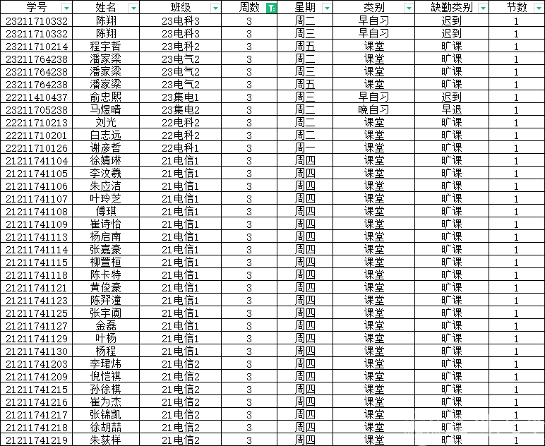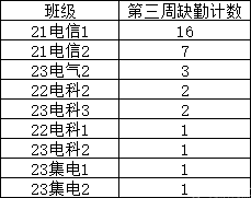 第三周早晚自习缺勤及课堂出勤情况如下:
