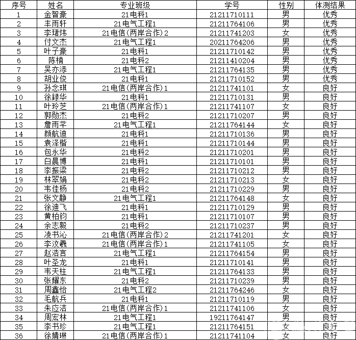 同时根据前期学院《关于蜜桃视频 开展学生阳光体质提升工程暨“金卡杯”体能训练营的通知》和浙江省教育厅反馈的抽测成绩,对其中抽测成绩优秀暨良好的金智豪等36位同学进行奖励,现对名单进行公示: