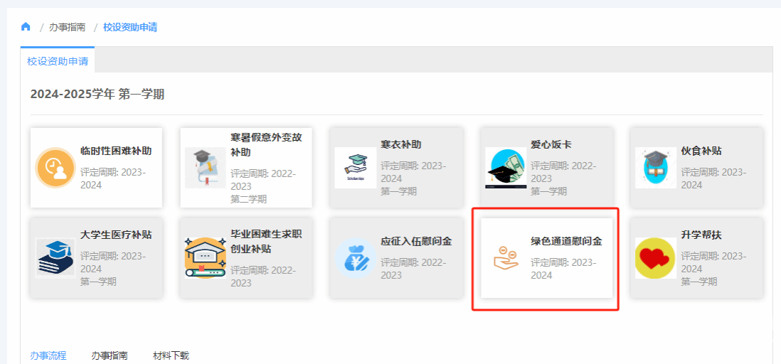 申请步骤:统一身份认证-学工系统-服务大厅-校设资助申请-选择“绿色通道慰问金”-填写申请理由并上传相关支撑材料的照片-提交-学院审核-学工部审核
