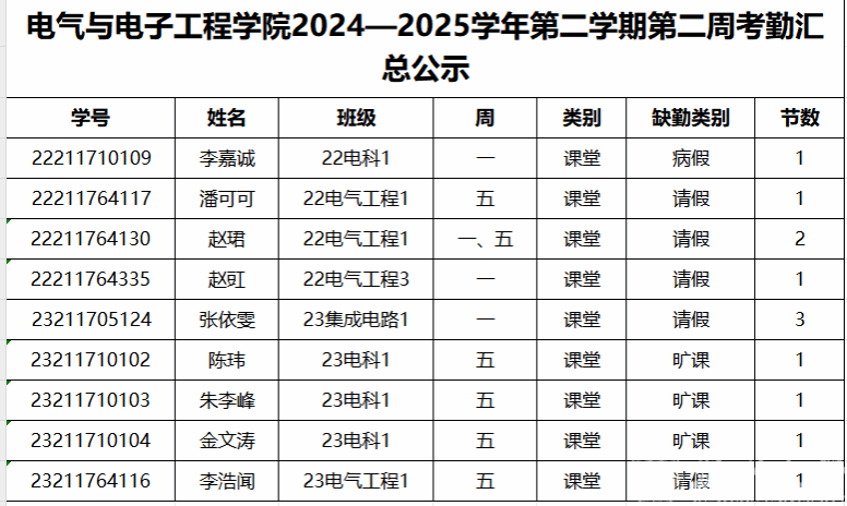 第二周早晚自习缺勤及课堂出勤情况如下: